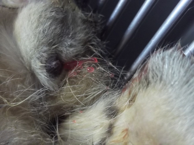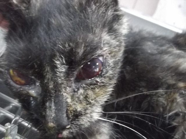 雙眼嚴重出血,全身脫水,與臉部疑是熱水淋臉傷口,全身多處傷口發現時已經奄奄一息躺在垃圾桶裡,當下有給予貓罐,但已經無法進食.所以直接送往高雄樂生醫院緊急醫治~還希望醫療費用能有善心人士一起分擔!謝謝