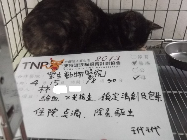 主題: 母玳瑁街貓車禍遭人丟棄虐待 申請者姓名: 楊士賢 花色: 申請日期: 2013-05-07 19:38:13 申請者部落格: 申請者臉書網址: 所在縣市/合作醫院: 高雄市/樂生動物醫院 治療費用: 9850元 需求人數: 11人 已結案 (2013-06-27 13:15:45) 報名人員: Ou Han x2(已付款)、lavinia(已付款)、夏元貞(已付款)、chiawei(已付款)、Milkbau Lu(已付款)、Selena Hsiao(已付款)、Freesia Tsai(已付款)、林家瑄、林家瑄(已付款)、Linda Kung(已付款)、Natasha Oreds Lin(已付款)、 候補人員: 動物病情說明: 在高雄市左營區明潭路邊發現一隻車禍撞擊後被人丟棄在垃圾堆等死的母玳瑁!
