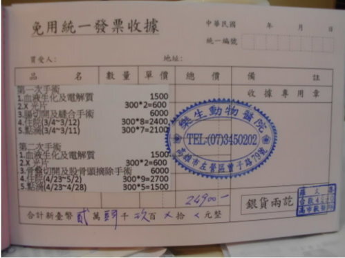 主題: 跛腳的貓咪 申請者姓名: 黃雅卉 花色: 申請日期: 2013-05-10 23:14:47 申請者部落格: 申請者臉書網址: 所在縣市/合作醫院: 高雄市/樂生動物醫院 治療費用: 24900元 需求人數: 26人 已結案 (2013-06-27 14:36:01) 報名人員: 胖姨 x26(已付款)、 候補人員: 動物病情說明: 在三民區灣愛里發現一隻貓咪走路跛腳,似行動有問題的貓咪,立即送醫經醫生診療,發現貓咪體內有許多排泄物,無法自行排出,X光檢查發現骨盆腔及腳骨折,骨盆變形壓迫導致排便困難,第一次緊急手術將腸切開把糞便取出,先解決積便可能會導致的巨結腸,術後貓咪狀況良好,先帶回中途照顧,每天餵食軟便劑和專用飼料,一個月後進行骨盆復位手術,因本人是學生無法支出這筆醫療費用懇求協會求助,請大家幫幫忙貓咪的兩次手術費用。謝謝!