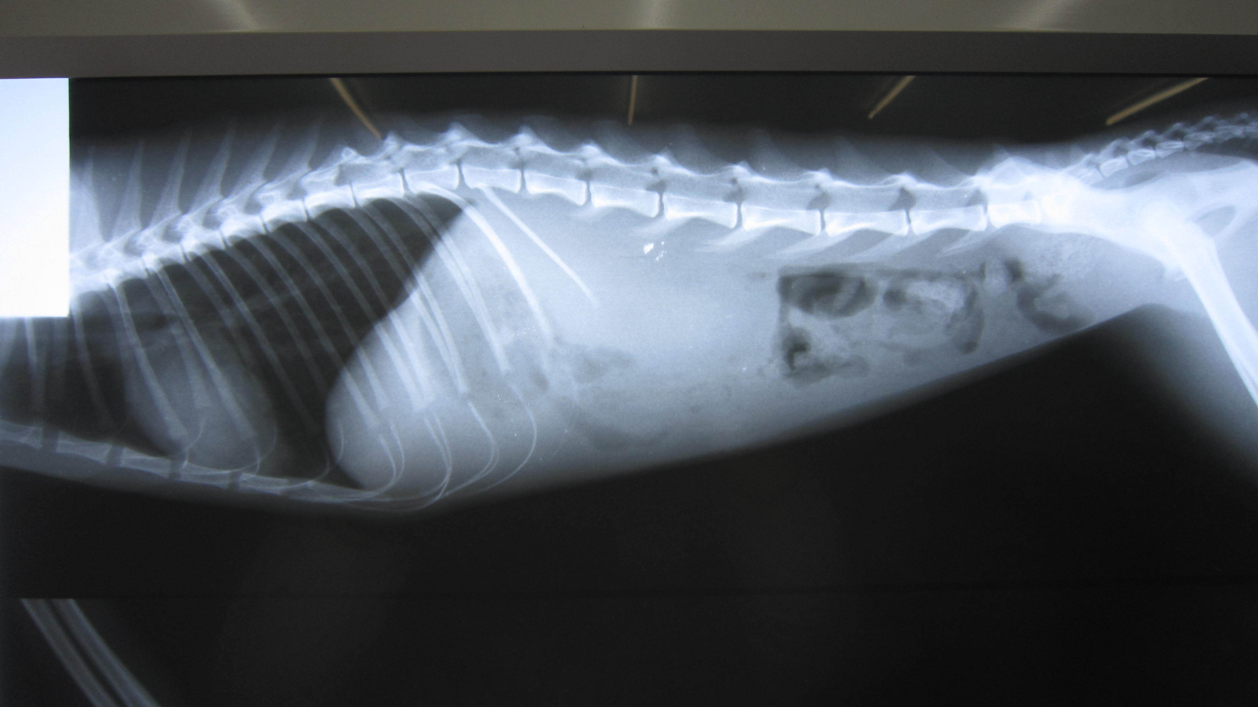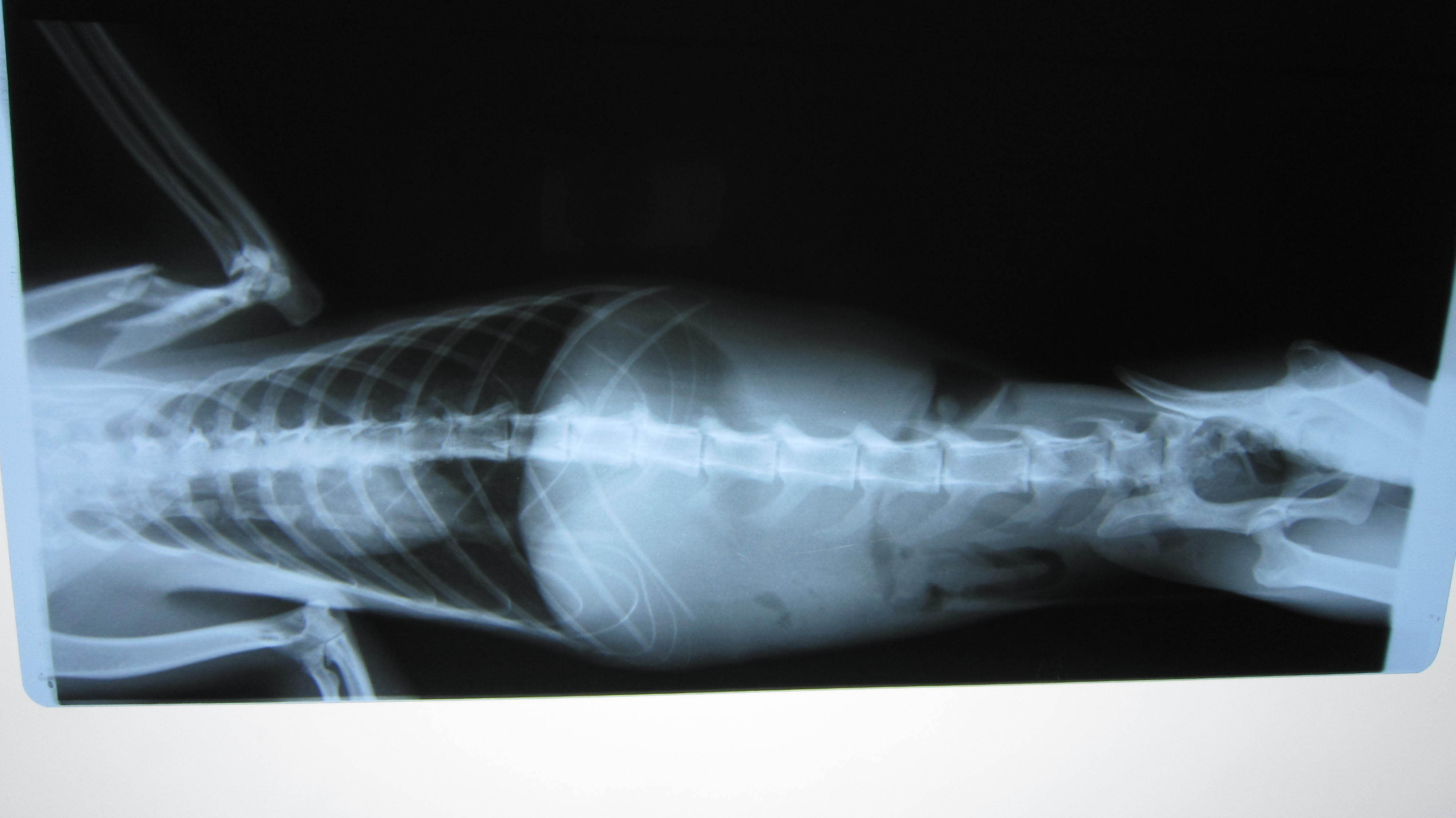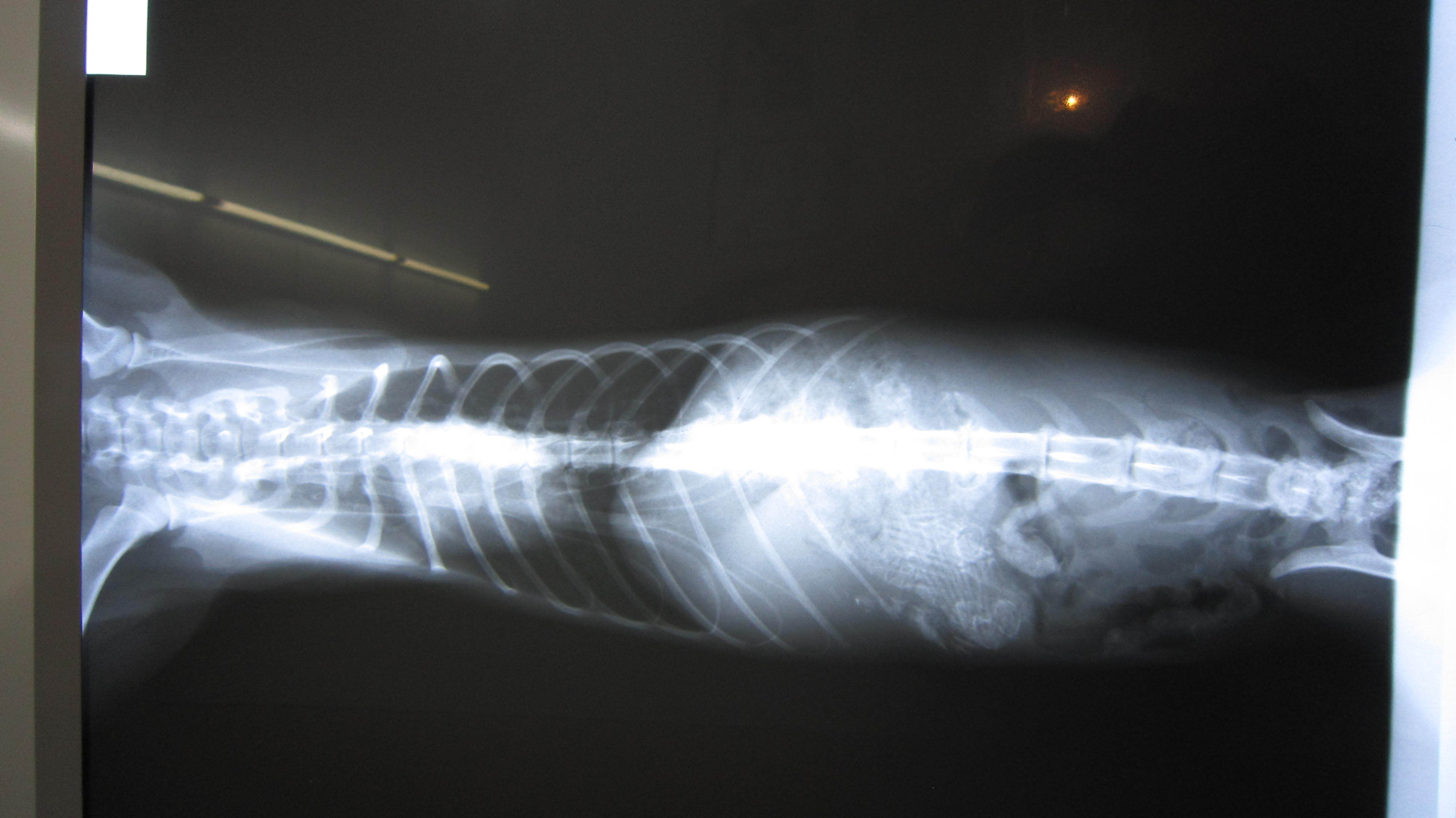 左前肢雖骨折但已能稍微站立,恢復情形較佳;後肢因關節韌帶受損、腳背傷口清創&肌肉腫脹,恢復較緩慢。