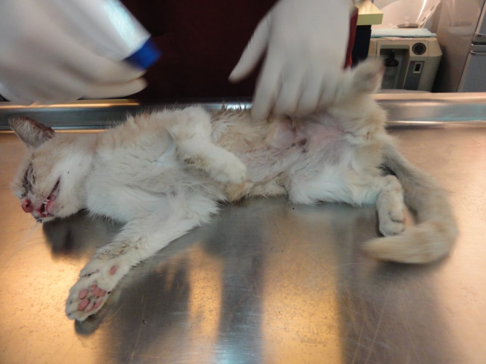 但住院期間血檢,白血球一直異常,高達9萬以上,雖其他狀況都已改善,但白血球一直降不下來,後來做細菌培養才發現,這貓體內有某種超級細菌,導致白血球異常,使用一般抗生素治療無效,只能用"萬古黴素",並與其他輸液,由皮下注射方式治療。