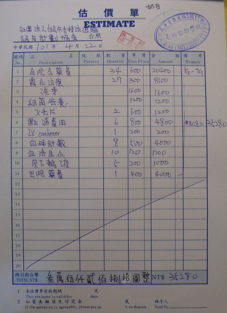 此貓被檢出有超級細菌,原本一度想將他安樂,因為放回後可能造成集體感染,中途又怕傳染其他貓咪,所以很難做決定,後來由長沁張醫師,致電給Mindy,討論治療方式、費用及時間,還是決定投葯救這隻貓,經過約一星期注射"萬古黴素"後,白血球降至正常值,投葯約10天後,此貓出院,由簡小姐帶回,已不考慮野放,先中途,待貓恢復元氣後,再安排送養事宜。動物近況說明: 20120507補充說明: