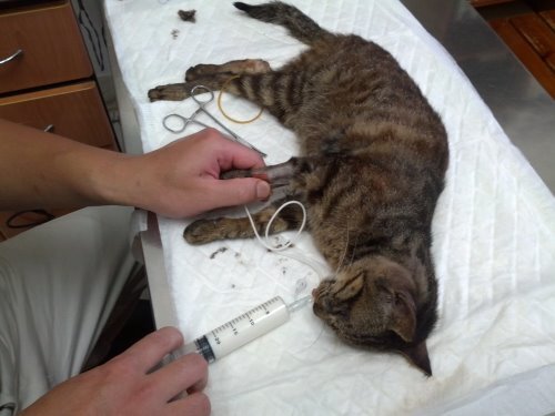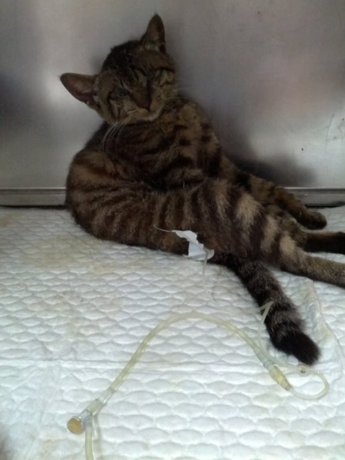 貓咪檢查後發現第一薦椎骨折,造成後半身癱瘓,眼睛也有病變,經過六天治療,貓咪都不願意自己進食,精神很差,每天醫師都有幫他擠尿按摩腹部幫助他排便,治療不見改善,幾經考量,為減輕貓咪的痛苦,只好以人道的方式送貓咪一程,還請各位幫忙貓咪。謝謝!
