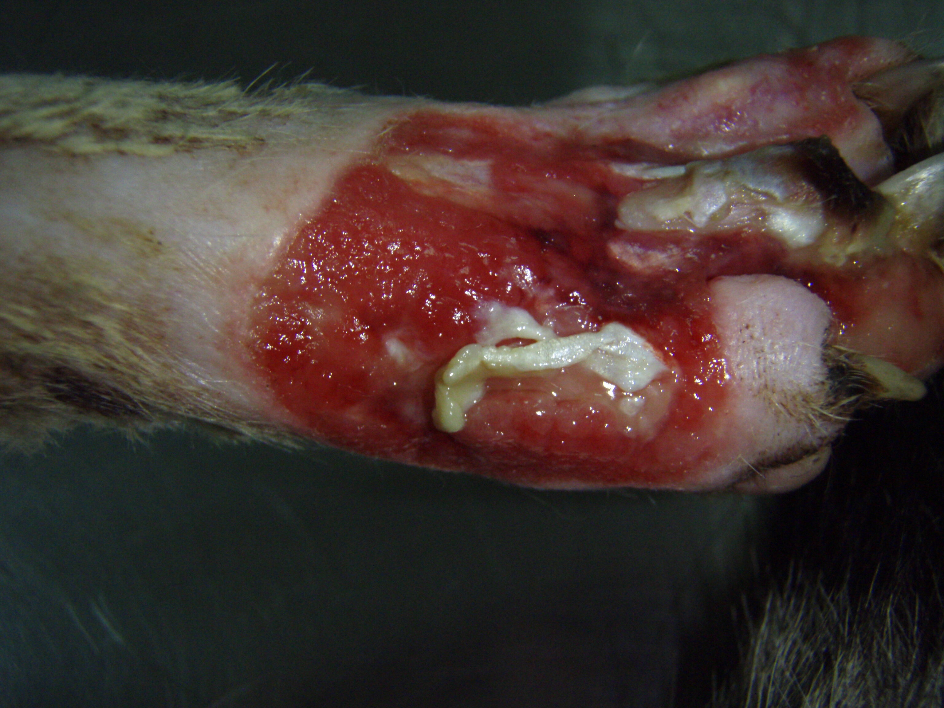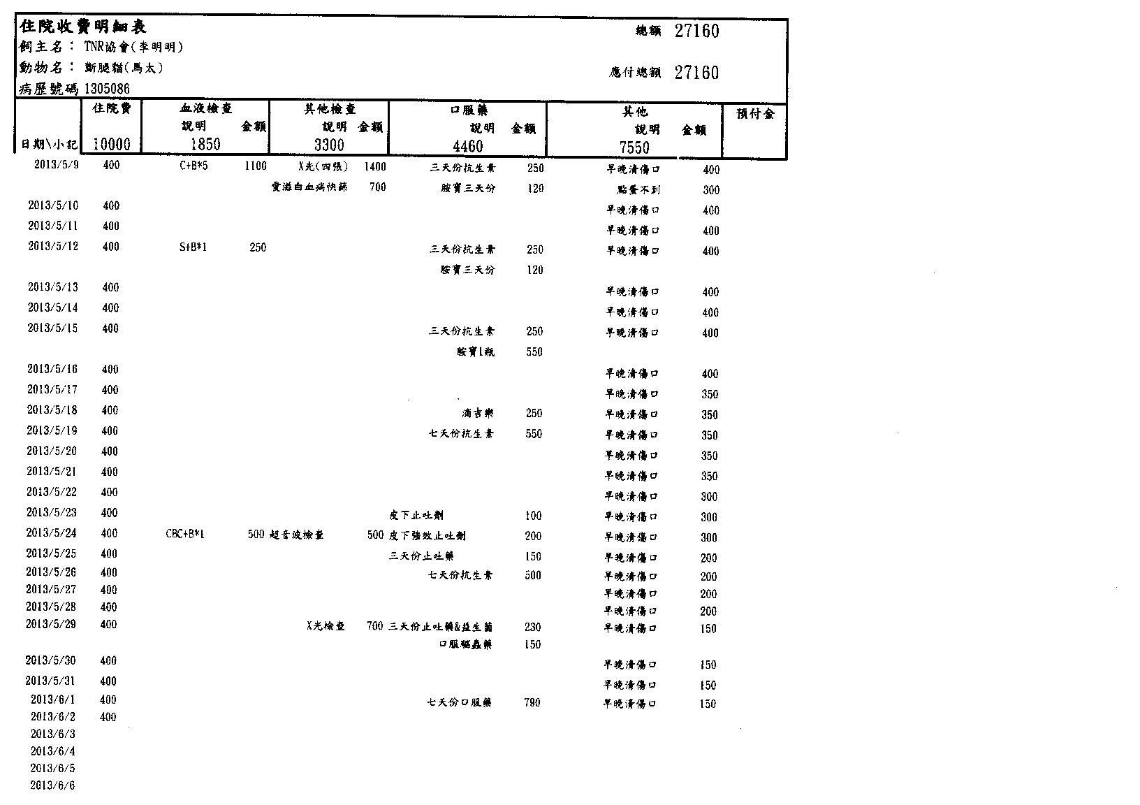 主題: 八德市大湳市場倒在路旁的斷腿貓 (第二次醫助通報) 申請者姓名: 李明明 花色: 申請日期: 2013-06-09 22:30:55 申請者部落格: 申請者臉書網址: 所在縣市/合作醫院: 台北市/長青動物醫院 治療費用: 27160元 需求人數: 29人 已結案 (2013-08-06 14:00:31) 報名人員: 白婷(已付款)、Forest(已付款)、Alison Lee(已付款)、euca(已付款)、言則(已付款)、miraai(已付款)、周小蕾(已付款)、sfeng(已付款)、vivian(已付款)、Rachel Chen x2(已付款)、宋小璉 x2(已付款)、chiawei(已付款)、suxiwen(已付款)、Ping Hussard(已付款)、PS Yeh x2(已付款)、Vinnie Hsu(已付款)、Iris Hsu、Iris Hsu(已付款)、nicole chen(已付款)、Sunny Chen、Sunny Chen(已付款)、蘇小優(已付款)、林嘉南(已付款)、Nonie Huang(已付款)、Ariel Yu-Ting Tu、Kyra Chu(已付款)、林艾蓁(已付款)、chiawei(已付款)、JASON(已付款)、 候補人員: 動物病情說明: 5/11白蛋白已由1.9上升至2.3,食慾佳;每天仍須早晚兩次左後腳背傷口清創,並配合抗生素治療,促進傷口癒合,醫院將視傷口癒合情形調整清創次數。腹水部分先以補充營養與熱量,觀察白蛋白指數回升情形,決定後續治療。另,醫生告知,觀察馬太昨天 (5/12) 有癲癇發作一次,目前繼續觀察中。左前肢雖骨折但已能稍微站立,恢復情形較佳;後肢因關節韌帶受損、腳背傷口清創&肌肉腫脹,恢復較緩慢。 動物近況說明: 斷腿貓(馬太) 6/2 出院,醫療費用合計27,160元 , 已帶回桃園就近照顧,限制活動並定時每日傷口換藥,穩定復原中。