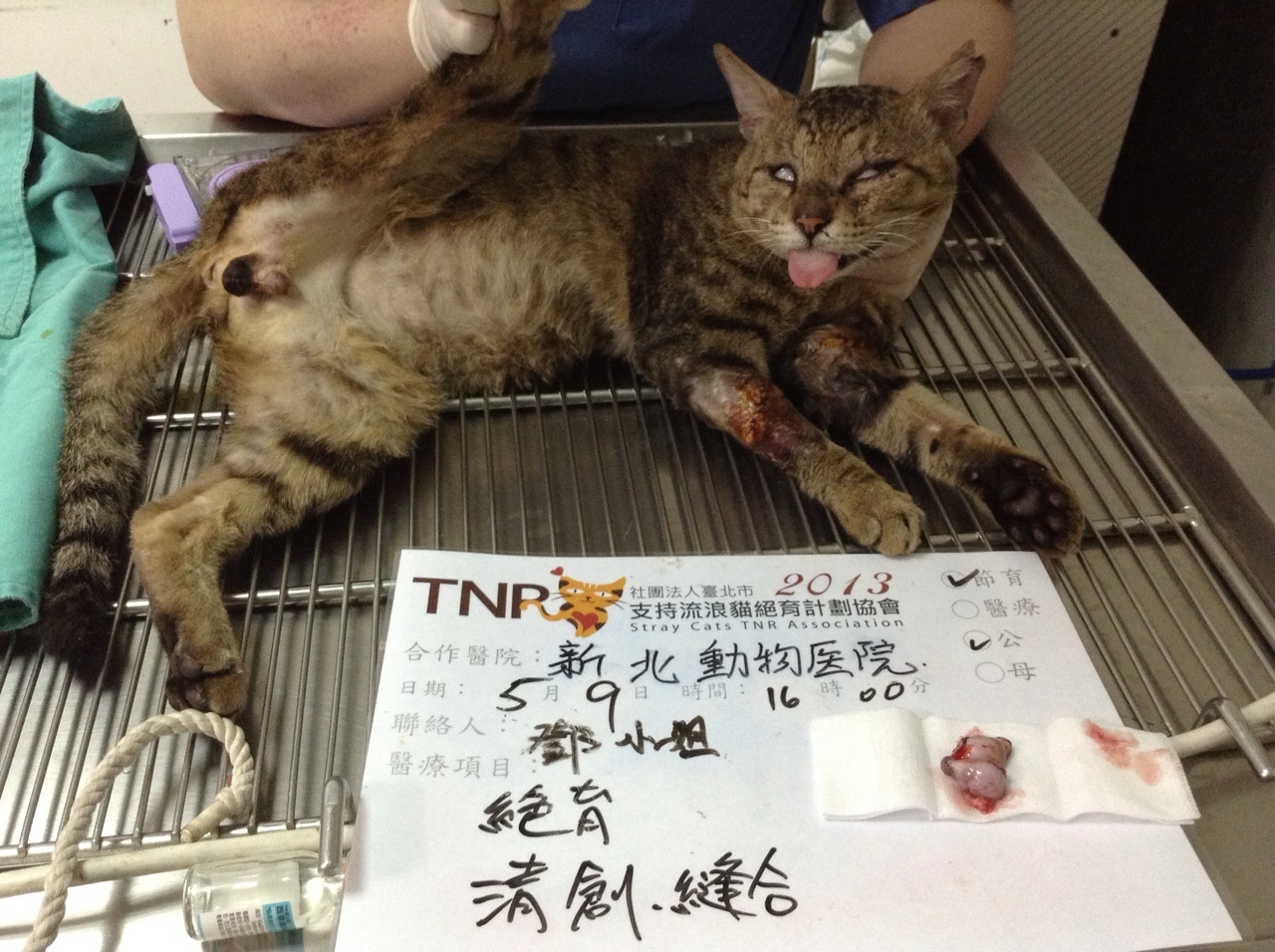 主題: 2隻腳都受傷的公貓 申請者姓名: 鄧伃絜 花色: 申請日期: 2013-05-30 03:43:03 申請者部落格: 申請者臉書網址: https://www.facebook.com/chun.chun.3998 所在縣市/合作醫院: 新北市/新北動物醫院 治療費用: 5550元 需求人數: 12人 已結案 (2013-06-27 14:25:22) 報名人員: philip x2(已付款)、Emily Chou x10(已付款)、 候補人員: 動物病情說明: TNR的貓咪