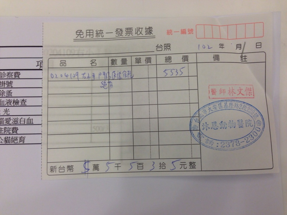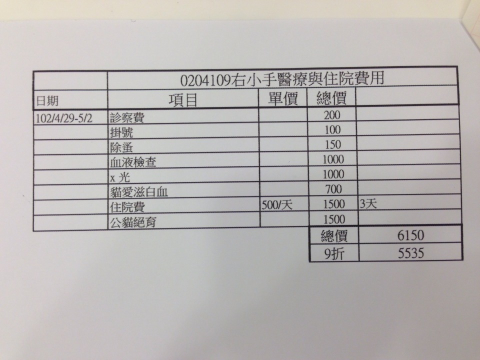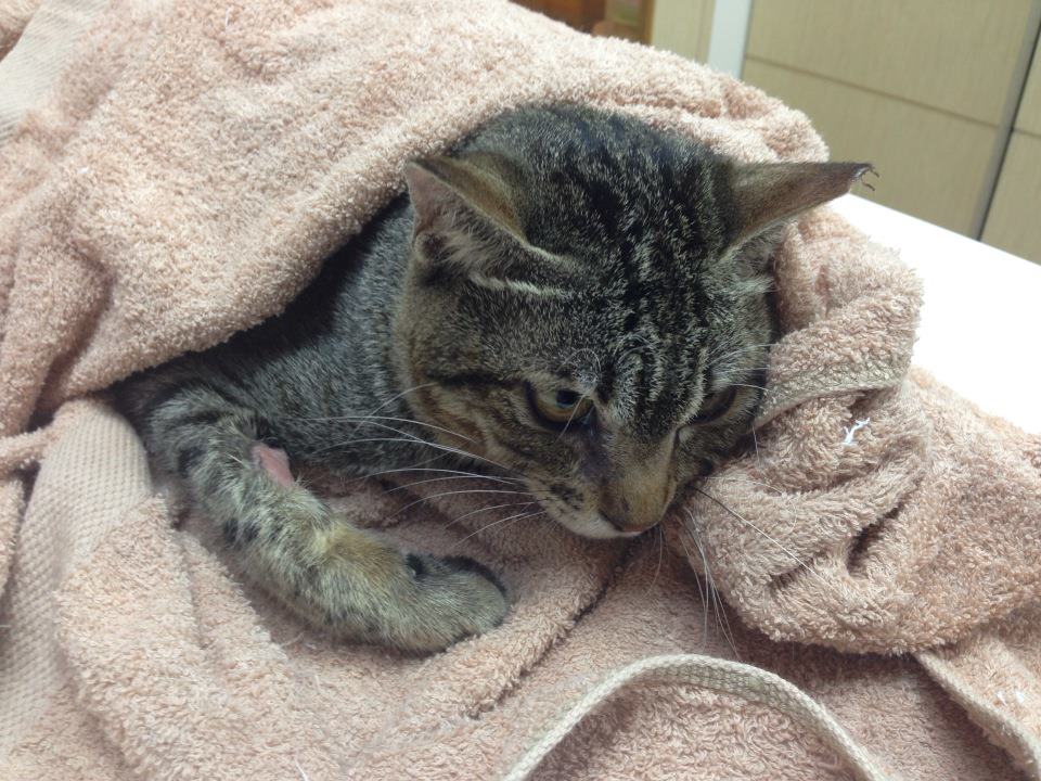 主題: 右前肢反折拖行 申請者姓名: 臺北市支持流浪貓絕育計劃協會 花色: 申請日期: 2013-05-13 11:10:09 申請者部落格: 申請者臉書網址: 所在縣市/合作醫院: 台北市/其他院所醫助專案(醫院請先MAIL溝通) 治療費用: 5535元 需求人數: 6人 已結案 (2013-06-27 13:12:24) 報名人員: 楊小淳(已付款)、Jau Shiang Hsieh(已付款)、catannchen(已付款)、yushi0304(已付款)、Nadia(已付款)、小娃(已付款)、 候補人員: 動物病情說明: 土城區虎斑貓咪因為爬椅墊被附近住戶毆打,導致前肢反折拖行,送醫檢查照X光發現,骨頭部分並無異常,血檢正常已進行結紮剪耳,醫師研判手部似激烈拉扯導致頸神經受損,從手臂到手掌無神經反應,本來留下手臂是為了平衡之用,但發現貓咪在跳躍的時候,沒有神經反應的手會勾到,拉傷劃破,為此進行第二次評估,醫師認為手已經變成累贅,沒有神經反應、肌肉萎縮、失去痛覺,有可能受傷而不自知導致危險,評估需要進行截肢手術。右小手每天都一直舔自己的小右手,然後發呆,他也覺得很奇怪,為什麼都沒有感覺...他會母雞蹲把小右手壓在身體底下,跳躍的時候都會阿阿叫好像很生氣為什麼手都不聽話,看了令人難過,截肢是為了保護右小手,為了日後生活品質,也只能忍痛進行手術。