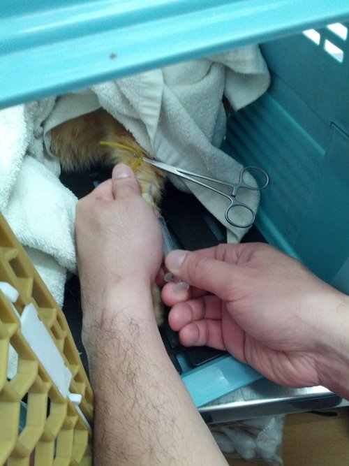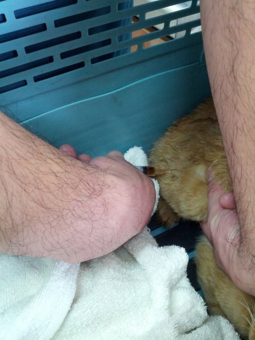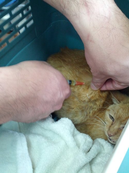 接著該出現在餵食基地的是此地貓老大「小黃妹妹」。據說有些年紀了!牠總是絲毫不差的繼「小寶妹妹」、「小小貓5號」後登場。而所有不管早到、晚到的貓兒们都會默契十足的等牠先開動進食,而今晚卻遲遲未見貓蹤。幾個學生開始基地大搜索,最後發現「小黃妹妹」奄奄一息的踡伏在巷尾的一輛休旅車底下,不斷的淒厲哀號著,餵牠也不肯進食。和孩子商量後,決定先送醫求救。因為老師的貓女兒家醫和「小寶妹妹」絕育手術都是在「淡水哲生獸醫院」,所以,由老師連夜送往醫院。大夥人滿腔的熱血、熱情,卻沒有一個人有救助病貓的經驗。怕孩子出手會被抓傷的老師,情急之下、一馬當先、空手擒貓,想當然爾,病貓拼命掙扎的抓、咬。事後,即便是吃了抗生素、補打了狂犬疫苗,一些較深的傷口依然化膿、流血,可見當時的「小黃妹妹」有多惶恐、多害怕!