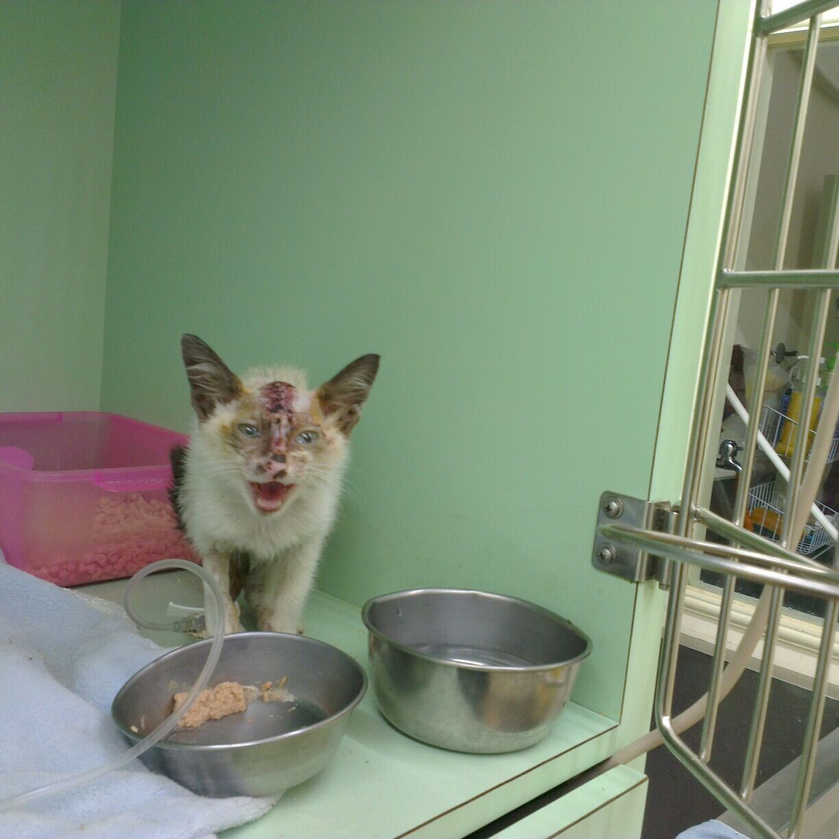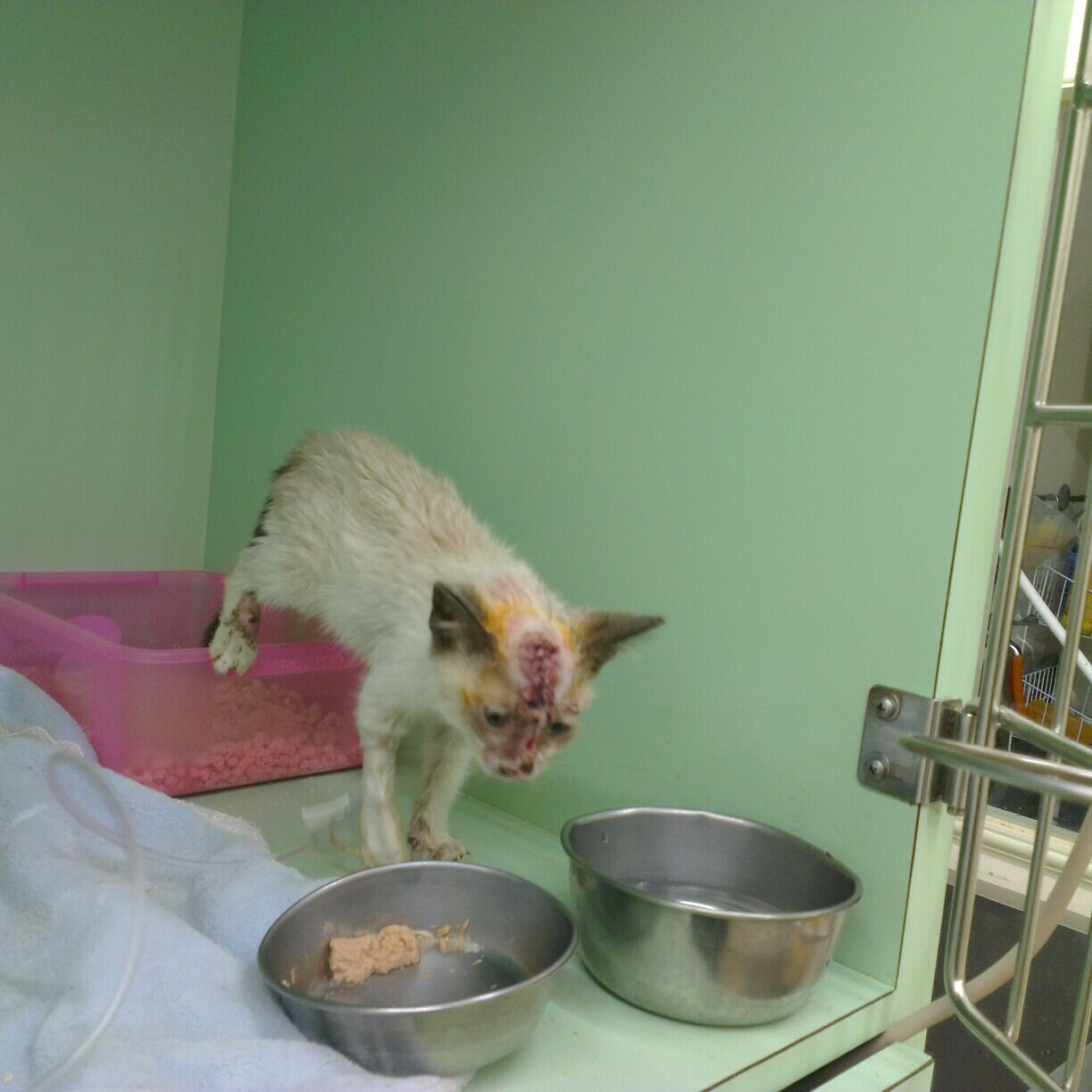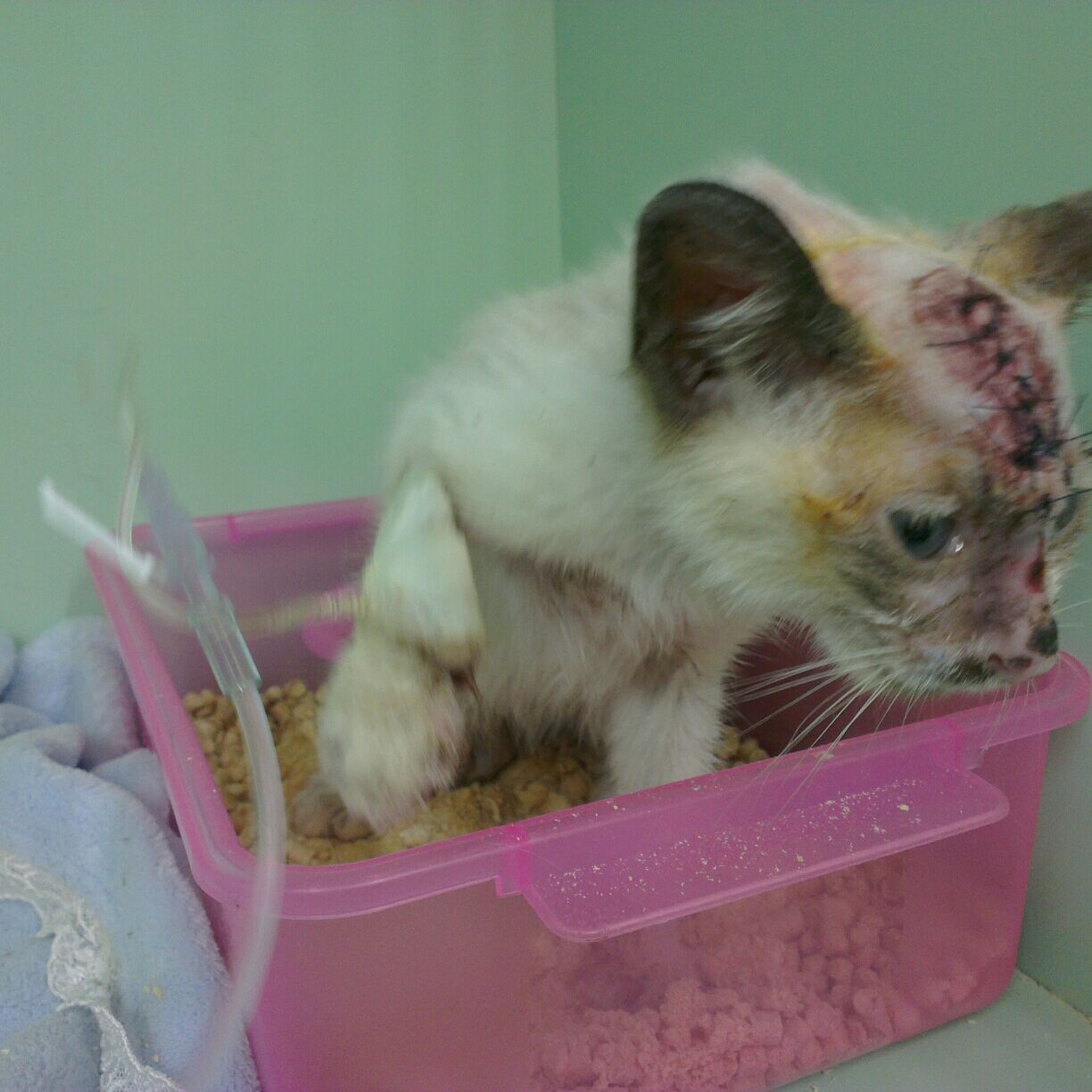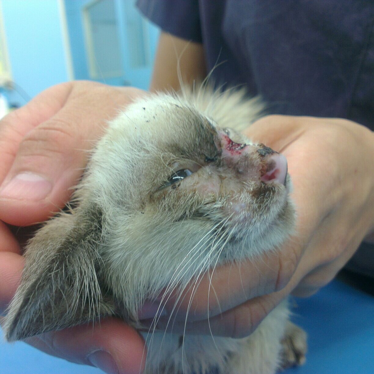 救援 四肢外傷潰爛 臉鼻腫脹鼻子有鈍傷腫脹的暹羅 已經先清創安置 左手手指有壞死 近期需要血檢與截去壞死的手指頭 後腳也有受傷