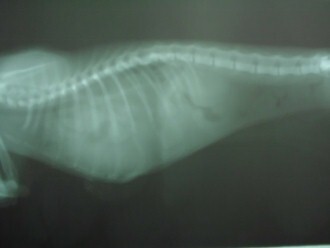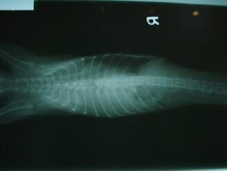 發現貓的橫隔破一個洞, 有可能是車撞到造成, 有些腹部的器官跑到胸腔, 肺只有一邊有作用, 消化系統也有影響, 所以不理她的話會慢慢死亡, 因為橫格修補須麻醉對這隻瘦弱的貓咪有危險, 而且貓的橫隔破裂已經不知多久, 但不修補她會沒命, 所以經過一番評估, 醫生進行手術搶救希望可以修補成功,貓咪最後沒撐過. 已經當天使去了..