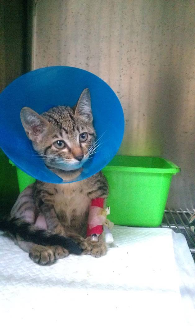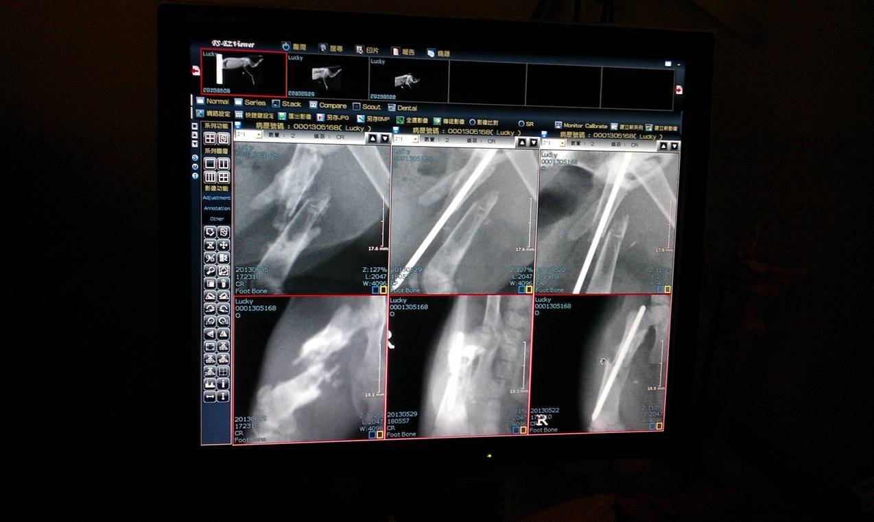 主題: 被狗咬斷腿的浪幼貓 申請者姓名: 盧穎新 花色: 申請日期: 2013-06-12 17:10:15 申請者部落格: 申請者臉書網址: 所在縣市/合作醫院: 台北市/長青動物醫院 治療費用: 16100元 需求人數: 18人 已結案 (2013-08-06 13:59:49) 報名人員: 緣緣寶貝(已付款)、Drew 酷朱(已付款)、陳玉璿(已付款)、Pannie Wang(已付款)、Patrick Liu x2(已付款)、Omelet(已付款)、Chianhuei Chu、Lana Hung(已付款)、ymcheung(已付款)、00(已付款)、黃朵菈(已付款)、小咘(已付款)、philip(已付款)、吳姿蓉(已付款)、niya、DC(已付款)、波波(已付款)、TOM WANG(已付款)、Veara Lin(已付款)、 候補人員: Sheirly Chu、愛貓凱、 動物病情說明: 5/19凌晨目睹一隻幼浪貓被大狗攻擊導致右大腿開放性骨折、左小腿骨裂,我抓到後送到24小時的中和中日動物醫院拍x光片並住院,5/19下午轉送長青住院,謝醫生清創後,5/20右大腿打入骨釘固定,5/22因為浪貓營養不良軟骨病骨骼薄如蛋殼的原因導致骨釘處崩裂,5/30移除骨釘配合鈣片補充幫助其骨骼自行生長恢復。 動物近況說明: 6/5的x光顯示左小腿骨裂處恢復狀況良好,右大腿骨骼也有逐漸癒合的趨勢,6/6接貓咪出院回家依醫囑關籠靜養至少一個月,目前已找到想要認養Lucky的人,待貓咪骨折部分痊癒後將托付認養人繼續照顧。