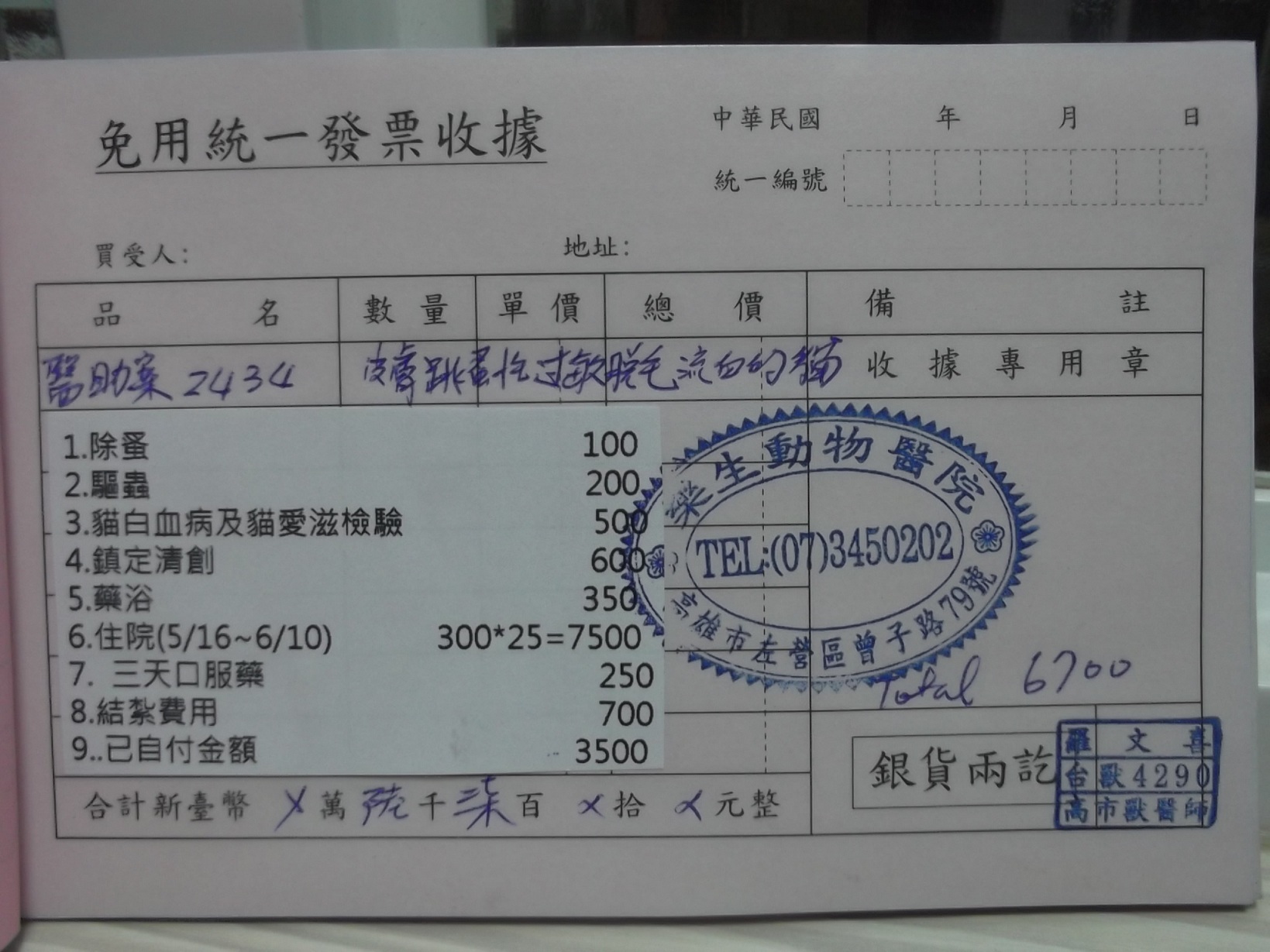 由於我的收入有限,加上也有在餵養浪貓,所以想請各位善心人士能幫幫我,我已先自行付了3500塊