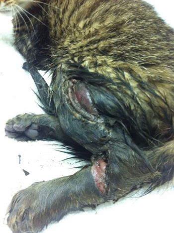 1.小虎斑腫大的左腳經醫生測試診察已無神經反應而癱瘓,且兩處見骨傷口嚴重感染,恐有轉為敗血症之虞,必須截肢保命。
