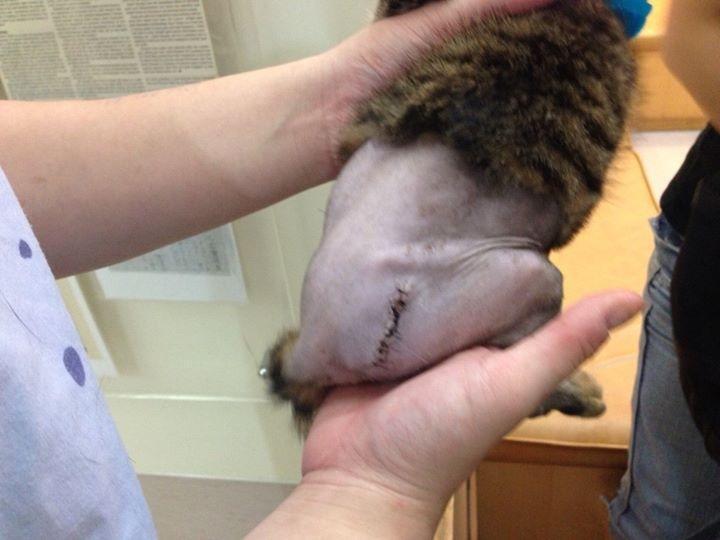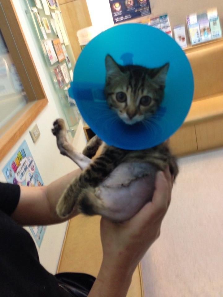 *術後狀況:勇敢的小虎斑,在醫療期間相當乖巧,展現極佳的配合度與忍痛耐力。手術拆線痊癒後能以三隻腳活動自如,且大小便均能自理。非常感激謝醫師精湛的醫術與協會的幫忙轉介醫院。