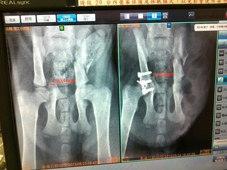 2.緊急將他送到24小時的太僕動物醫院急診穩定生命跡象,並暫時清創包紮已嚴重感染的左腳兩處大傷口,且由X光發現骨盆腔兩側已骨折斷裂。