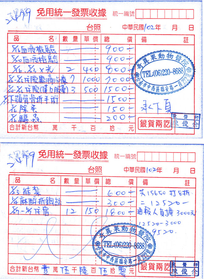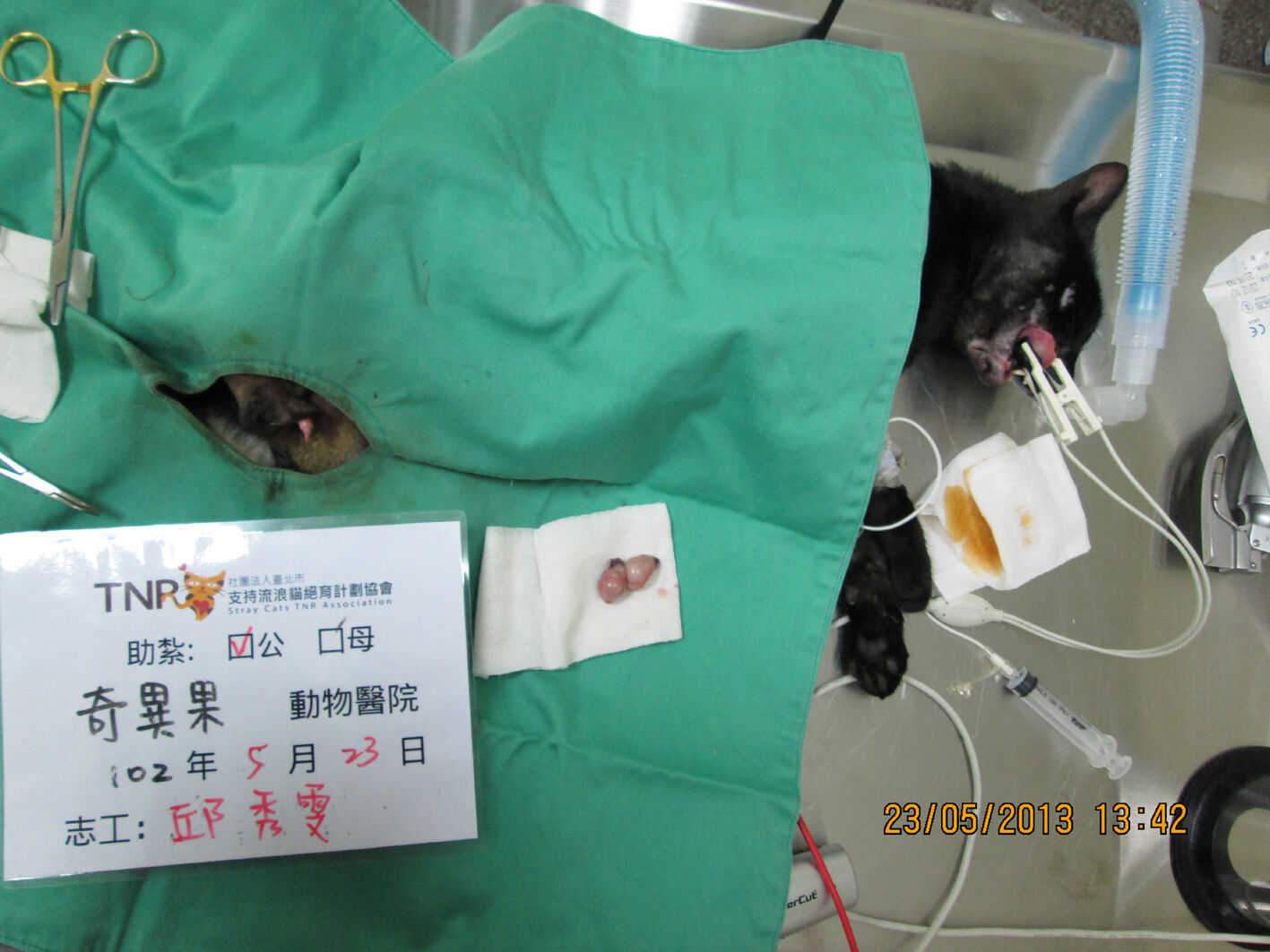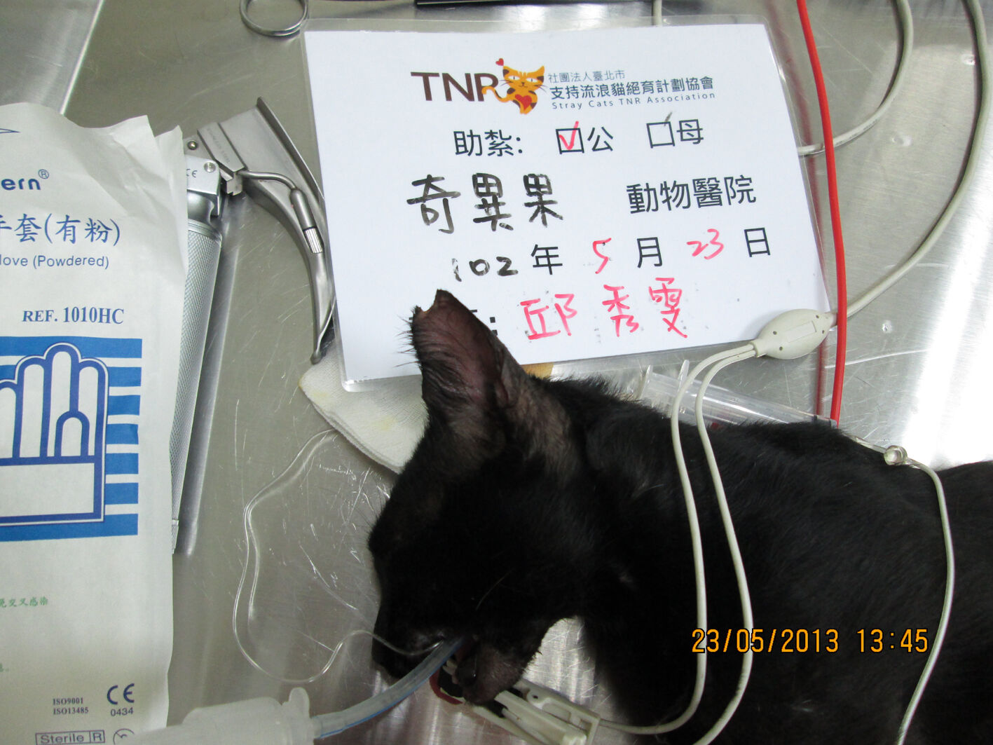 主題: 車禍貓咪(肺出血、下顎骨折、下巴開創傷、結紮) 申請者姓名: 邱秀雯 花色: 申請日期: 2013-06-07 22:45:40 申請者部落格: 申請者臉書網址: 所在縣市/合作醫院: 台南市/奇異果動物醫院 治療費用: 9520元 需求人數: 11人 已結案 (2013-07-16 12:27:28) 報名人員: 叮噹貓(已付款)、chiawei(已付款)、Yuan Hsing-Ping(已付款)、沈宗仁(已付款)、緣緣寶貝(已付款)、Jade(已付款)、Nanna Liu(已付款)、Alumi Lu(已付款)、Daniel Lin(已付款)、溫以容 x2(已付款)、 候補人員: 動物病情說明: 5.16晚上送車禍黑貓到奇異果醫院醫療,檢查發現有車禍造成的肺出血、下巴開創傷、下顎骨斷裂的鋼絲固定手術、牙齒有撞斷幾跟(但不會影響進食)、牙齦有被撞翻開(讓牠自己慢慢恢復)。