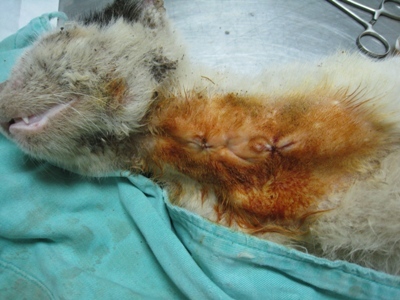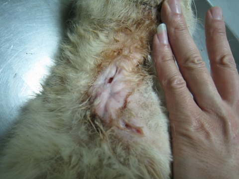 誘補到後就直接將它帶到銘德動物醫院,經過吳醫師診斷後確定為疥癬蟲感染,此外其下巴還有2個被咬的傷口,當下就決定直接進行住院治療。