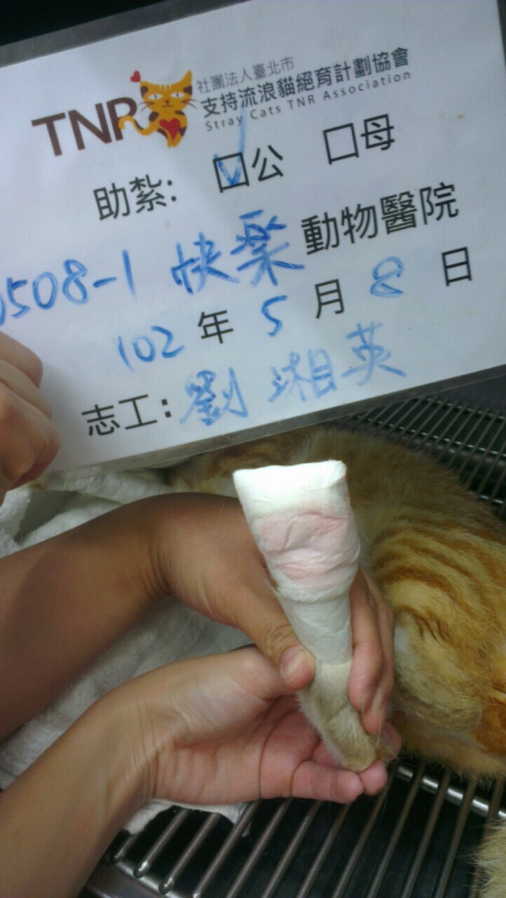 主題: 眷村空地腳掌受傷腫大且驗出有胰臟炎及貓愛滋的小橘子 申請者姓名: 劉湘英 花色: 申請日期: 2013-05-29 19:04:50 申請者部落格: 申請者臉書網址: 所在縣市/合作醫院: 彰化縣/快樂寵物醫院 治療費用: 4000元 需求人數: 9人 已結案 (2013-06-27 13:09:34) 報名人員: 周星星(已付款)、Bow Huang x4(已付款)、beforn(已付款)、Liwing Lin(已付款)、阿章(已付款)、Hsin-Yi Chiao(已付款)、 候補人員: 動物病情說明: 我是彰化志工,我這邊眷村空地新來的親人小橘子浪貓(應該是被人丟在這的),已餵食了一個禮拜,突然後腳掌腫大起來,本來就想送結紮就順便治療腳傷,5/8送醫,結果腳傷是由很小傷口感染裡頭都是膿,又引起淋巴腫大,且又有其他症狀:嘔吐、牙齦發白,口很臭,抽血也很難抽,血很清,醫生懷疑是胰臟炎,結果試劑一測有胰臟炎,先打點滴治療貧血與傷口打抗生素。