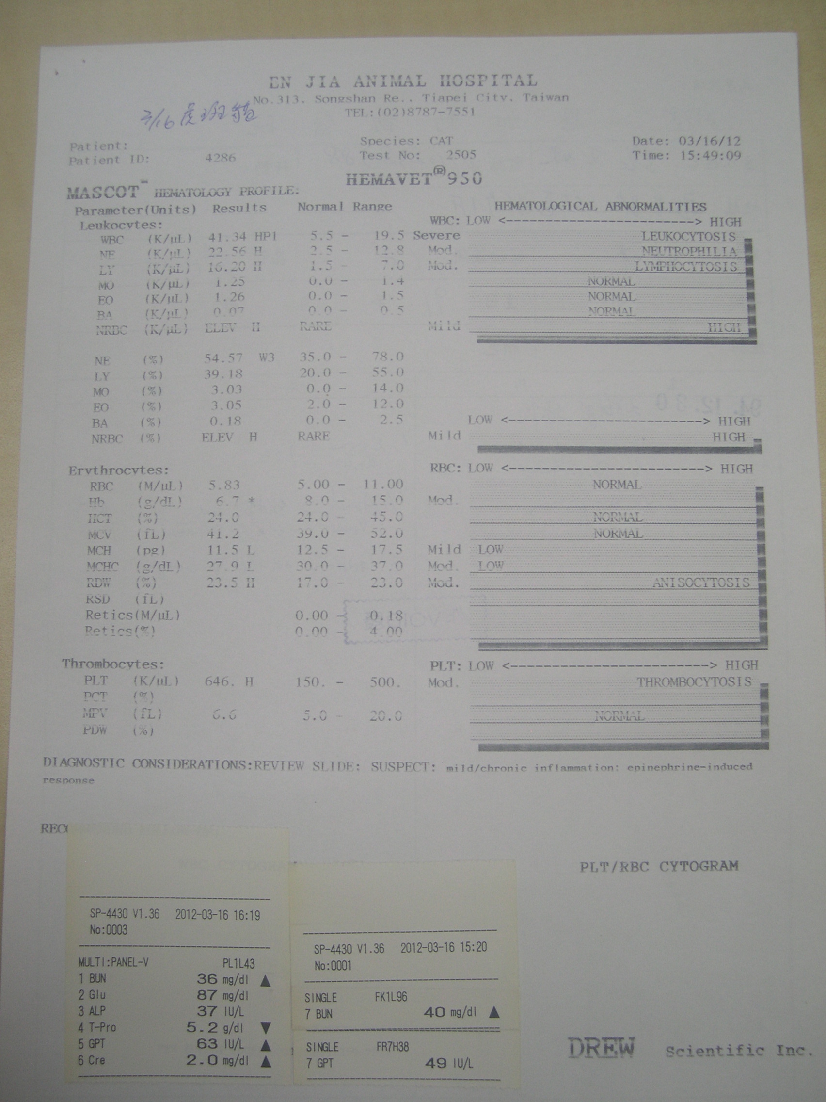 主題: 白血球居高不下三度入院的打噴嚏虎斑貓 申請者姓名: 鄧伃絜 花色: 申請日期: 2012-04-30 10:35:18 申請者部落格: 申請者臉書網址: http://www.facebook.com/profile.php?cropsuccess&id=1174612506#!/profile.php?id=1174612506 所在縣市/合作醫院: 台北市/恩加動物醫院 治療費用: 3550元 需求人數: 4人 已結案 (2012-05-25 00:01:35) 報名人員: 陳大貓(已付款)、福祿壽(已付款)、Fg Jan(已付款)、周小蕾(已付款)、 候補人員: 動物病情說明: 這個可憐的孩子是由志工劉秀珍小姐救起的