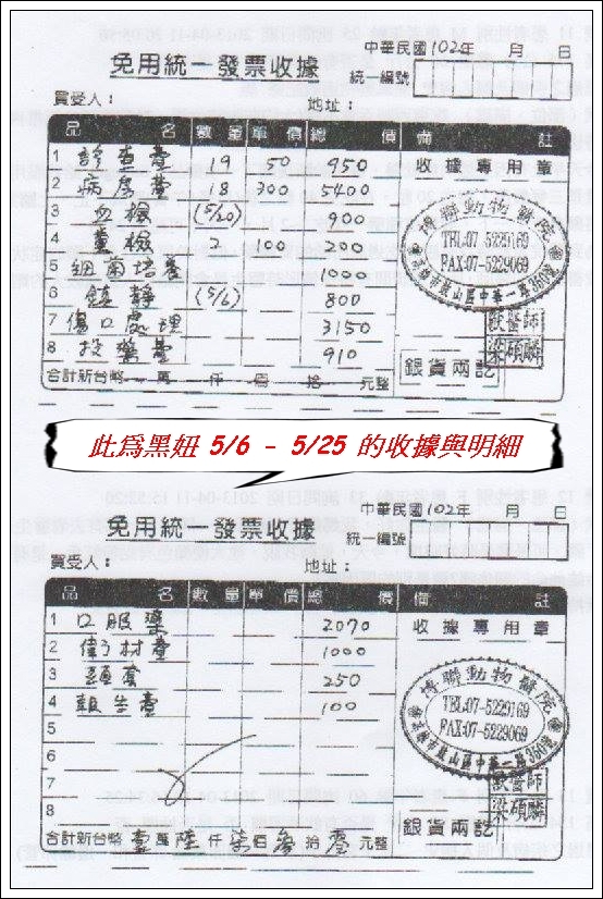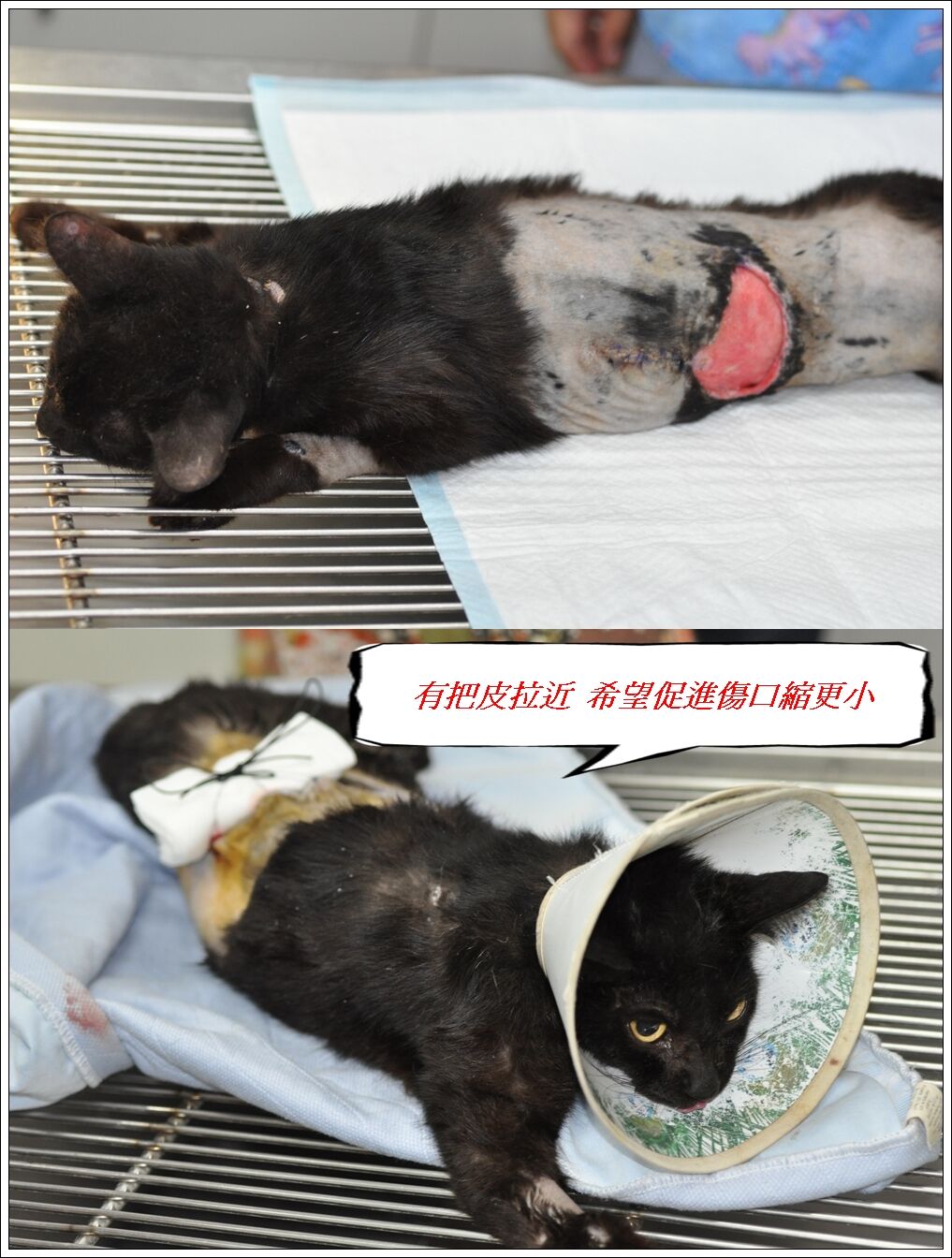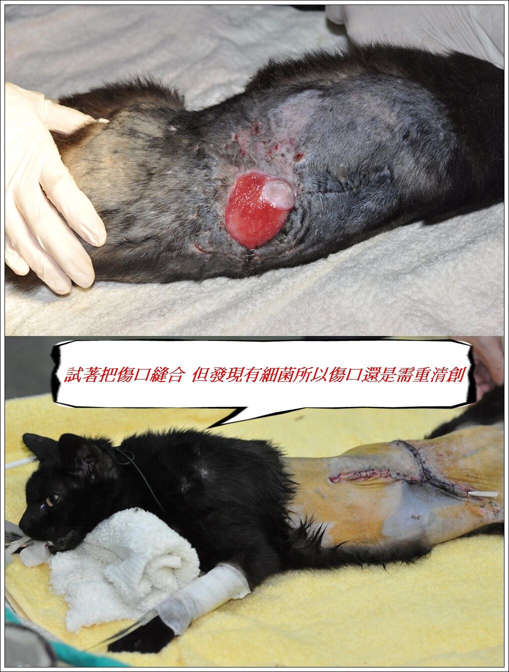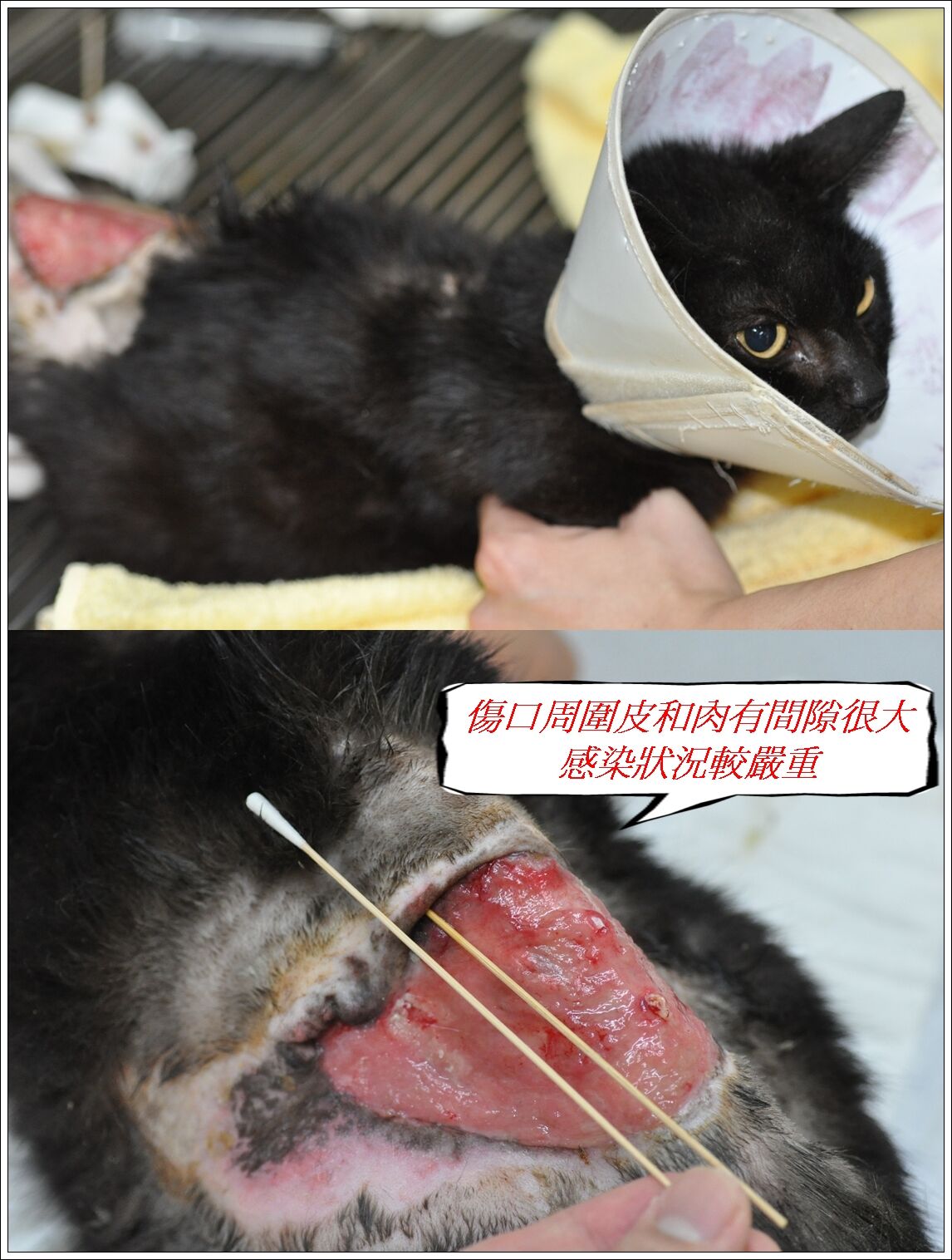 主題: 高雄中崙二路被割一層皮肉的黑母貓 第二階段 申請者姓名: 劉雅雲 花色: 申請日期: 2013-06-02 03:57:21 申請者部落格: 申請者臉書網址: 所在縣市/合作醫院: 高雄市/博聯動物醫院 治療費用: 26600元 需求人數: 28人 已結案 (2013-06-27 13:04:47) 報名人員: 何春生(已付款)、Bow Huang x2(已付款)、Shirley Tsai x2(已付款)、FS.NG(已付款)、Angel Liao(已付款)、Kiki Liang(已付款)、WeiLin Chen x2(已付款)、林微利(已付款)、Weili Chang x2(已付款)、七一四(已付款)、蝠蝠(已付款)、伶伶(已付款)、Ethan Chang(已付款)、Angel Huang(已付款)、Jason Chang(已付款)、Chia Chien Hsiao(已付款)、Meimi Chung(已付款)、Hope Liao(已付款)、Nicky Lin(已付款)、Shu-Yun Luo(已付款)、Yiting Chen(已付款)、Amber Lin(已付款)、Bebe Wang(已付款)、vigia(已付款)、 候補人員: 饅頭麻包子、Froggy Chiu、 動物病情說明: 這是在高雄中崙二路有一個小檳榔攤那邊有很多浪狗還有一隻黑黑的東西很像貓, 但皮膚上有一層白白的東西, 我停下車去問並仔細一看, 貓咪身上一層皮肉不見了, 檳榔攤的人說一個月前, 因為貓咪親人疑似被割了一層皮和肉下來, 傷口很嚴重, 他們不知怎麼辦就只好幫貓撒廣東苜藥粉, 可是一直都沒好. 貓送到協會合作醫院後,醫院馬上幫貓咪做清創, 整層都是壞掉的皮削所以都先清除, 經過一番清創貓咪留在醫院做治療並每天換藥, 貓咪原本恢復的很好傷口也變小, 醫生幫貓咪做把皮拉近的小手術, 原本試著把傷口縫合, 但縫合後發現滲出物又變多, 所以又重新清創, 目前又做了一次細菌培養, 但還是有細菌的問題. 感謝博聯動物細心的照顧與治療, 貓咪嘗試了不同的抗生素對抗細菌, 但因為傷口感染的狀況嚴重, 也謝謝高雄志工Sally 5/25協助帶黑妞北上 轉院繼續接受治療. 上回申請第一階段的治療費為4/19-5/5的費用, 這次申請第二階段包含黑妞4/10-4/18補申請9870, 還有5/6-5/25的費用16730 Total:26600 <明細請看附圖第七張與第八張> 謝謝大家的幫助捐款救救這隻傷重的貓咪.