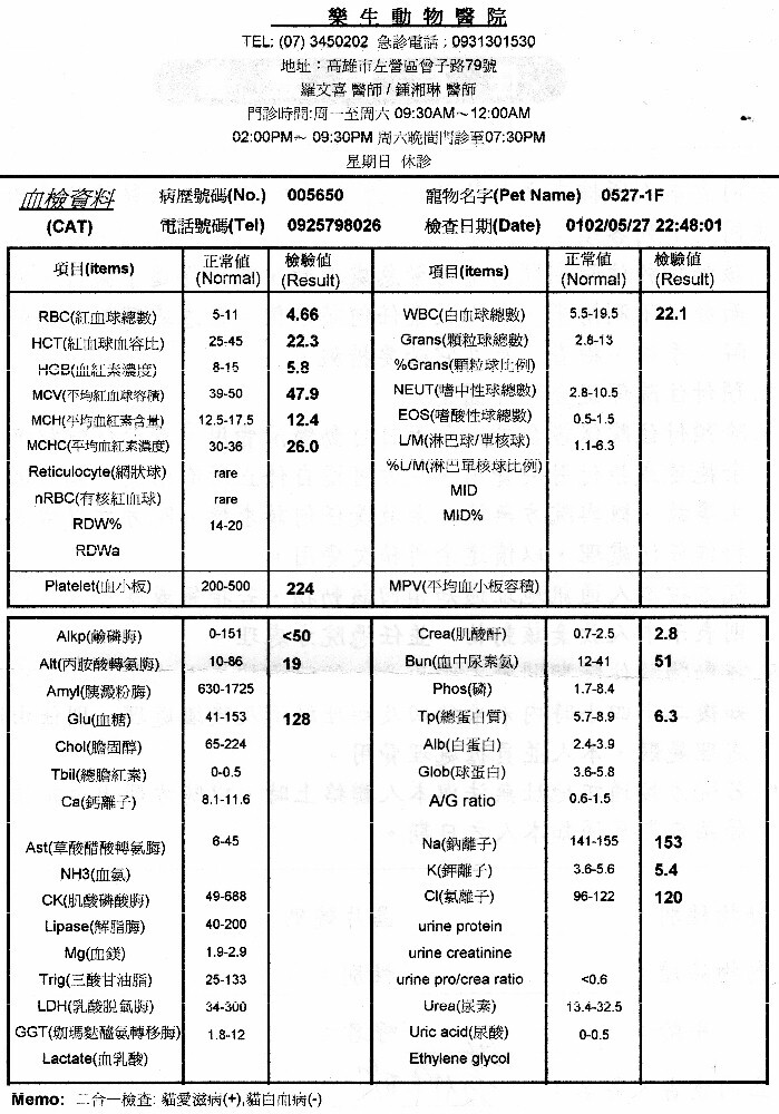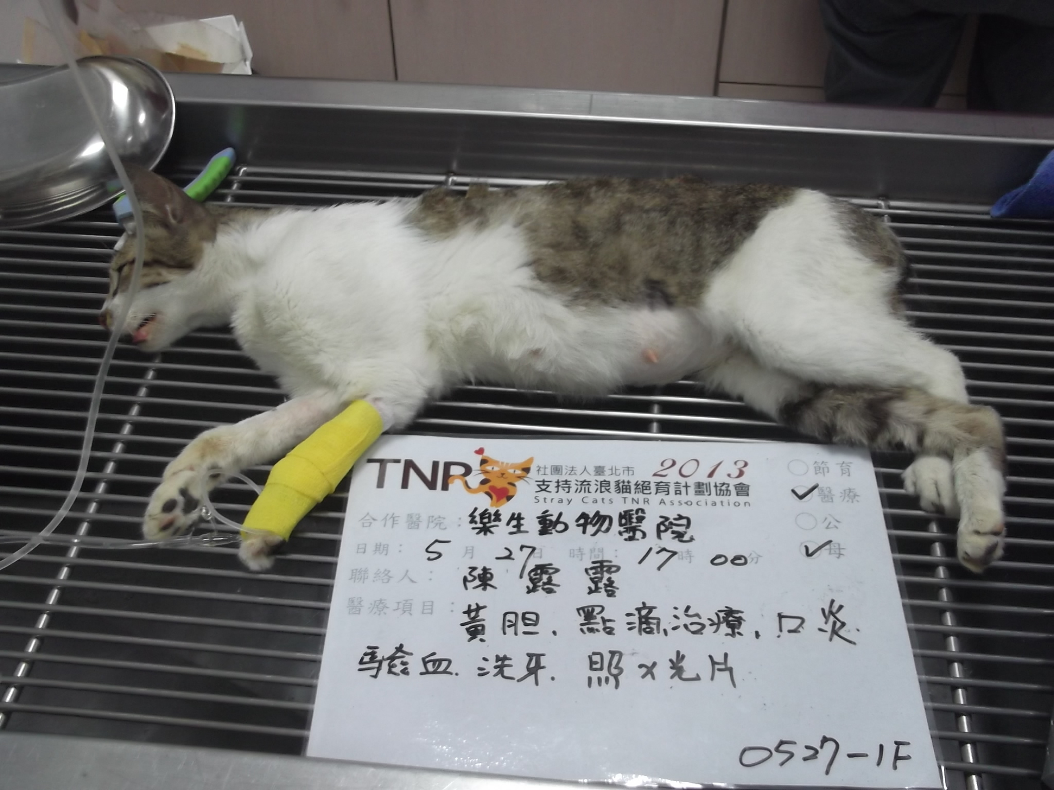 主題: 嚴重黃疸愛滋貓 申請者姓名: 陳露露 花色: 申請日期: 2013-06-21 08:39:17 申請者部落格: 申請者臉書網址: 所在縣市/合作醫院: 高雄市/樂生動物醫院 治療費用: 14900元 需求人數: 32人 已結案 (2013-07-16 12:27:06) 報名人員: Yuki Natumei x2(已付款)、April Chen x2(已付款)、pheles(已付款)、Liwing Lin(已付款)、Choco Chen x2(已付款)、mavis(已付款)、喵喵 x2(已付款)、Bubu Wang(已付款)、Bella(已付款)、skylung x2(已付款)、Ivy Ho(已付款)、Kimi Huang(已付款)、紀惠青(已付款)、Claire Huang x2(已付款)、Lori Shen x2(已付款)、Nata Chen(已付款)、心安平安(已付款)、SeiJi Lin(已付款)、Angel Liao(已付款)、錢曼尼(已付款)、YinShiuan Chang x2(已付款)、Sunny Chen(已付款)、aile(已付款)、Shirley Tsai(已付款)、 候補人員: 動物病情說明: 此貓來志工餵養區不到一個月,