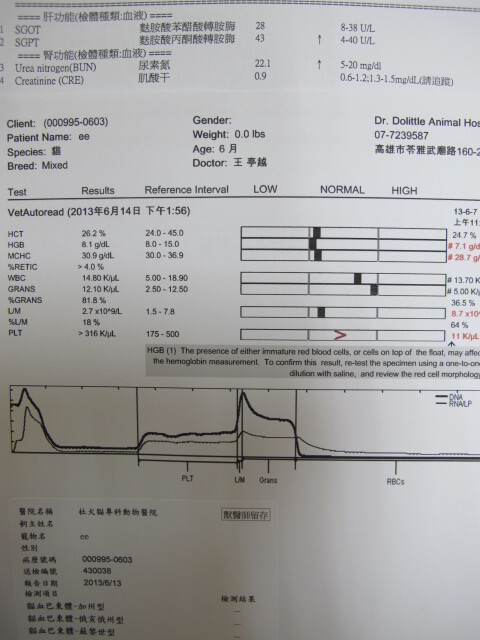 食慾差、貧血、有嘔吐狀況、發燒(40.6)