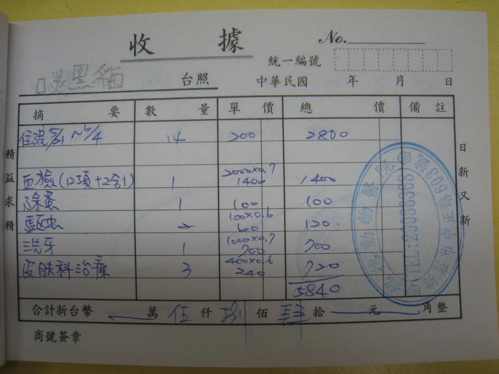 隔離住院2週2800 洗牙700,皮膚治療720,血檢1400,除蚤100,驅蟲120。
