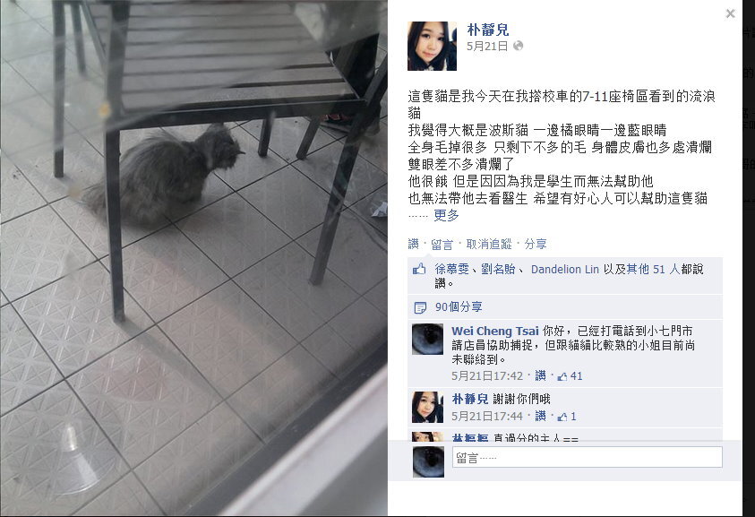 這隻貓是我今天在我撘校車的7-11座椅區看到的流浪貓