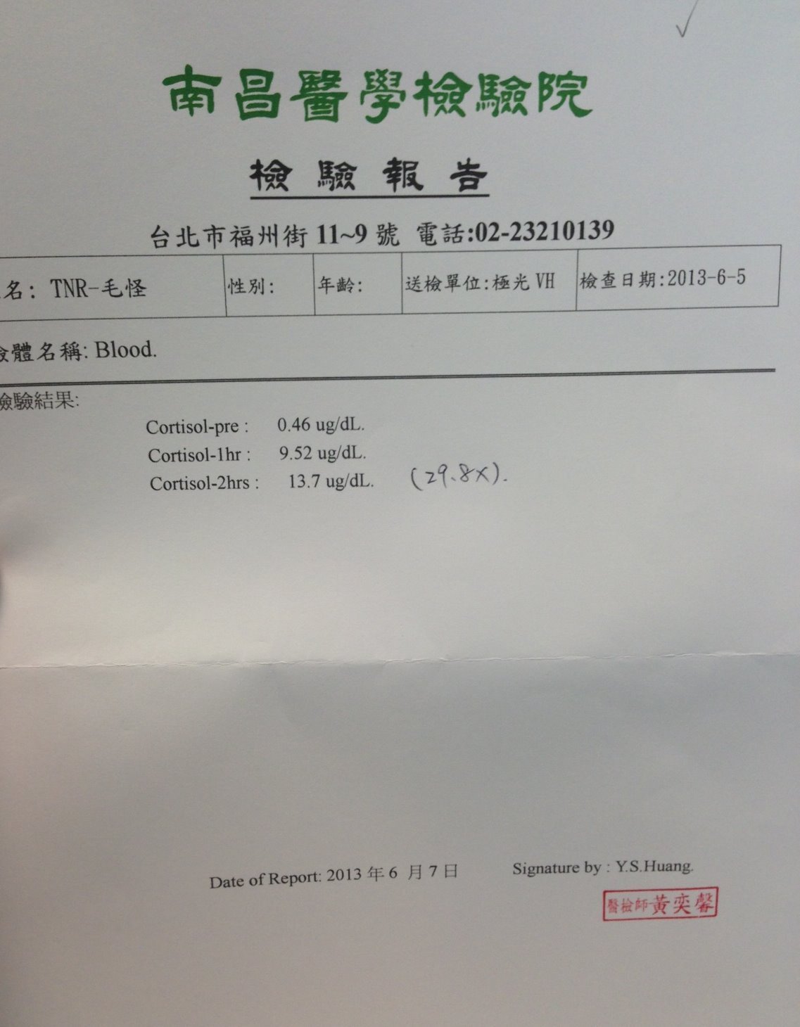 6/10檢驗報告出爐Cortisol腎上腺皮質固醇是正常貓咪的29.8倍,目前先使用內分泌藥物控制腎上腺。