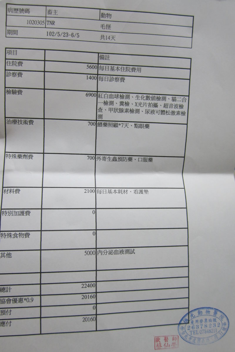 貓咪由彰化志工許桂菱和朋友協助捕捉送至台中,由熱心貓友M.l. Chen接力送回台北,送醫採樣檢驗不是黴菌也不是疥癬,血液檢查都正常,沒有愛滋白血、沒有貓瘟,食慾極佳、排尿很多、排便也很多,醫師懷疑是內分泌的問題,先將尿液和血液送檢,住院治療穩定後已先接回照顧。
