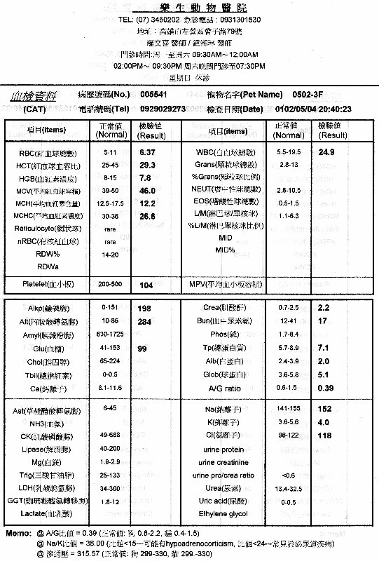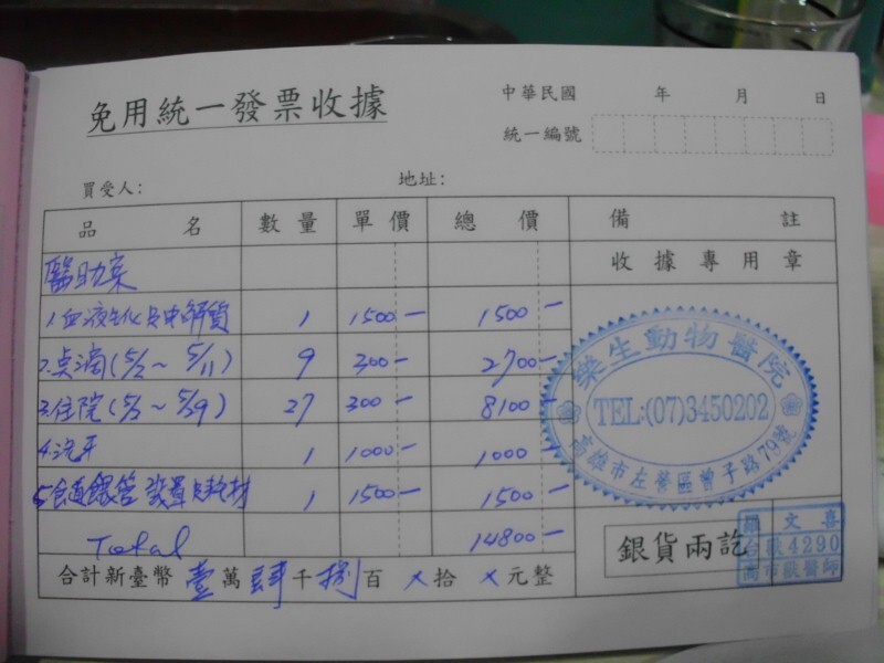 主題: 小港廠橫路 口炎有腹水的貓咪 申請者姓名: 劉雅雲 花色: 申請日期: 2013-06-15 02:08:53 申請者部落格: 申請者臉書網址: 所在縣市/合作醫院: 高雄市/樂生動物醫院 治療費用: 14800元 需求人數: 16人 已結案 (2013-08-06 14:30:48) 報名人員: lavinia x2(已付款)、煎塔媽(已付款)、Cathy Kao(已付款)、蔡秀芳(已付款)、Lorelei Tsai(已付款)、陳滴咕、陳滴咕(已付款)、Shumi Tsai(已付款)、Ching-chun Chang(已付款)、ste7396(已付款)、Ciara Ting(已付款)、ginatw(已付款)、Kate(已付款)、惠惠(已付款)、小黃(已付款)、Juen-Nien Lin(已付款)、 候補人員: 動物病情說明: 這是小港廠橫路誘捕結紮的貓咪之一, 因為很多隻母貓都在哺乳中,所以找到公的和沒在哺乳的就趕快誘捕, 結紮手術時, 醫生發現有腹水流出需觀察, 貓咪還有嚴重口炎, 醫生有幫她洗牙, 並且有扁桃腺腫大, 可能是因為嚴重口炎不舒服, 貓咪在院不吃, 醫生幫她灌食, 但貓咪會吐出, 所以醫生幫她插食道餵管, 還有幫她血檢, 並上點滴. 貓咪狀況一度很危急, 還有醫院細心照顧下貓咪慢慢地恢復, 並且能自己進食才出院. 醫療明細如下: