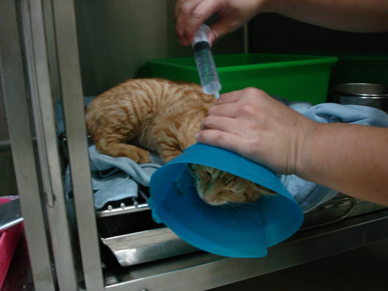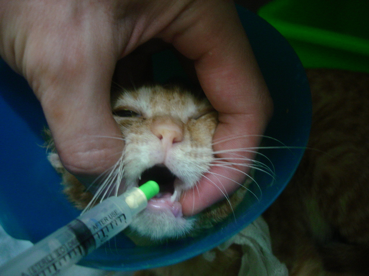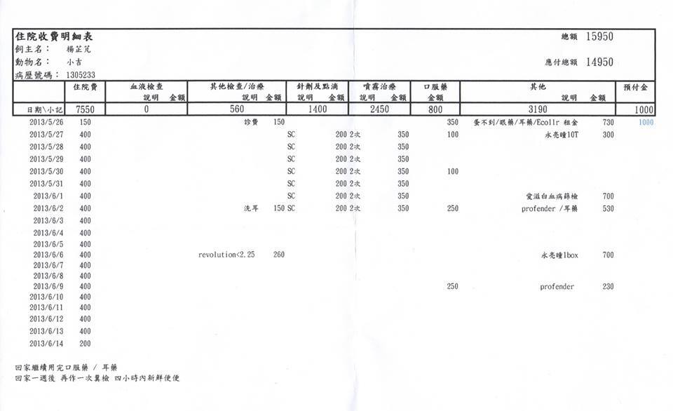 醫生判斷為嚴重泡疹病毒感染且體內(多種寄生蟲)體外(跳蚤、耳介蟲等)一堆蟲,採取呼吸道噴霧治療,以及體內&外驅蟲!但小貓留院幾日不進食亦無排泄,故注射點滴補充養分與人工餵食。醫生認為小貓比初估狀況嚴重,原預計住院10~14天,延至三周才好轉出院。
