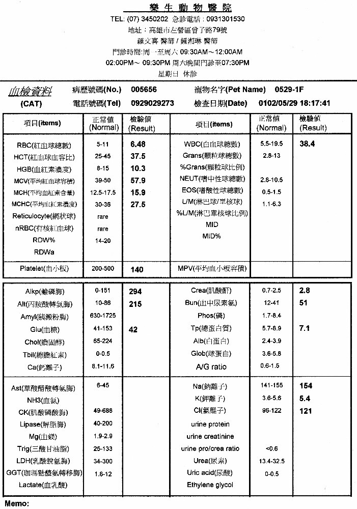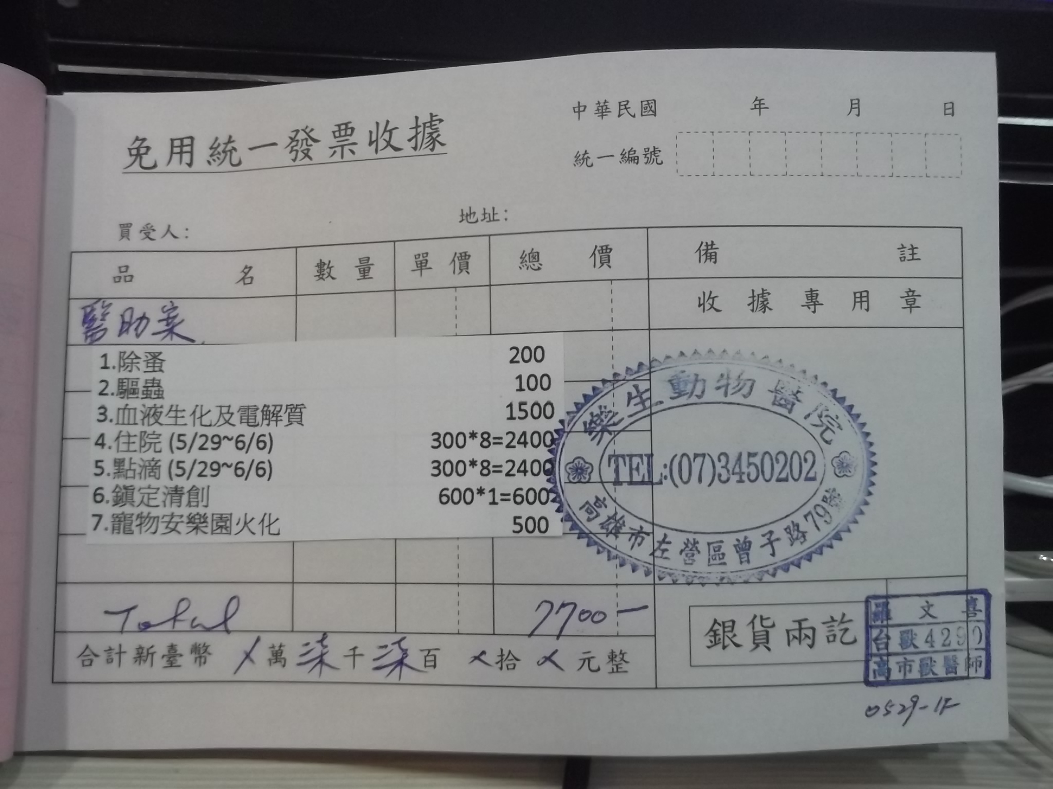 主題: 小港廠橫路 肚子破一大洞的母貓 申請者姓名: 劉雅雲 花色: 申請日期: 2013-06-20 17:44:49 申請者部落格: 申請者臉書網址: 所在縣市/合作醫院: 高雄市/樂生動物醫院 治療費用: 7700元 需求人數: 19人 已結案 (2013-08-06 14:30:26) 報名人員: 收夕(已付款)、Sara Lin(已付款)、Nick Tai(已付款)、yiju(已付款)、Peggy Chen、Erina Lin(已付款)、阿偉、黃、汪汪汪 x2(已付款)、Liwing Lin(已付款)、Miki Wu、Vicky Chang Shyr(已付款)、Yu-Chun Liou(已付款)、呂阿達(已付款)、Bella(已付款)、小P(已付款)、陳柏睿、Teenie Yu(已付款)、游佳雯 x2(已付款)、小娃(已付款)、Karen Yang(已付款)、駱xx(已付款)、 候補人員: 動物病情說明: 這是在廠橫路 友友托兒所 之前就發現有很多貓咪, 每隻母貓幾乎都在哺乳中..本來是想抓公貓結紮的..沒想到罐頭開 架好誘捕籠 出現好多隻垂奶母貓...這一隻一看就怪怪的.好像肚子破一個洞, 所以誘捕她送到合作醫院治療. 到醫院後先清創, 發現腹部破裂, 貓咪發高燒, 有口炎, 因為傷口裡有感染, 所以還不能縫合. 經過好幾天的努力, 貓最後還是當天使去了, 送了她一程, 讓她不是橫死在街上. 感謝各外的幫忙與善心捐款.