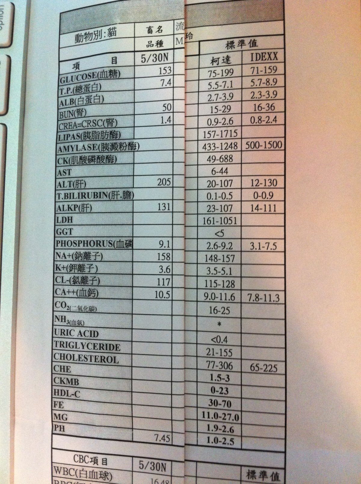 血液檢查結果顯示貓咪有嚴重的脫水,貧血現象。肝腎指數略高,其他傳染病與貓愛滋則呈現陰性反應。