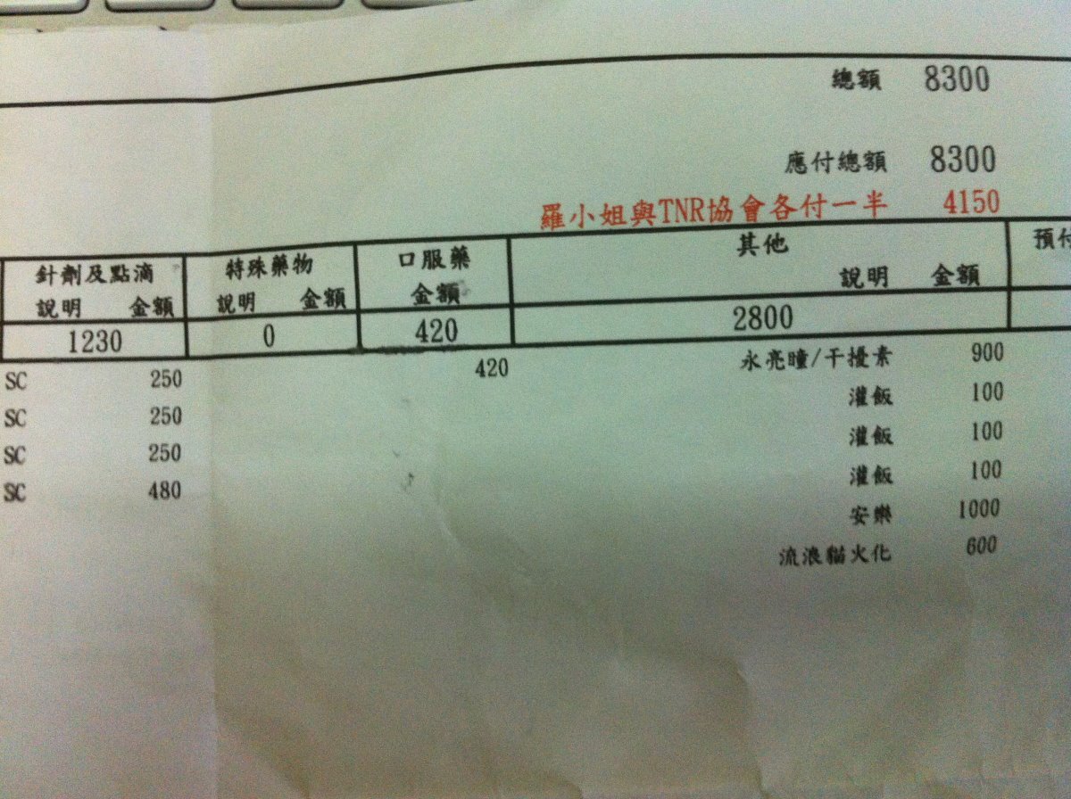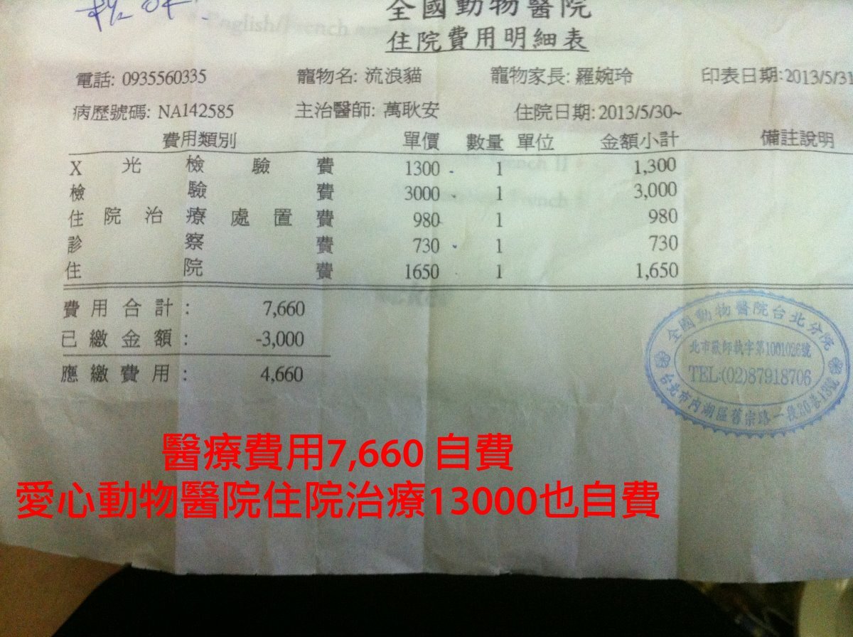 隔日轉回貓現貓咪較近的動物醫院,本想萬一情況危急需要緊急輸血,比較方便帶貓前往協助,到第二家愛心動物醫院治療,醫師懷疑是自體免疫再生不良性貧血,無法透過輸血得到很大的幫助,前後兩家醫院動物醫院住院和治療費用累計已經兩萬多元遠遠超過我們能力所能負擔,但總不能置之不理。