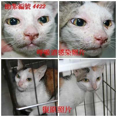 主題: 呼吸道感染、皮膚病及前後肢受傷街貓 申請者姓名: 劉怡杏 花色: 申請日期: 2012-05-05 11:44:22 申請者部落格: 申請者臉書網址: 所在縣市/合作醫院: 高雄市/回生動物醫院 治療費用: 8600元 需求人數: 12人 已結案 (2012-11-25 22:08:07) 報名人員: 嘟嘟(已付款)、Manto Tin.(已付款)、Manto Tin.(已付款)、Manto Tin.(已付款)、kuang、楊咪咪(已付款)、MiYa(已付款)、楊咪咪(已付款)、Kevin Lin、connie(已付款)、Silvia Wang(已付款)、洪瓊娟(已付款)、小舟(已付款)、小舟(已付款)、 候補人員: 動物病情說明: 愛心志工陳露露餵養的街貓