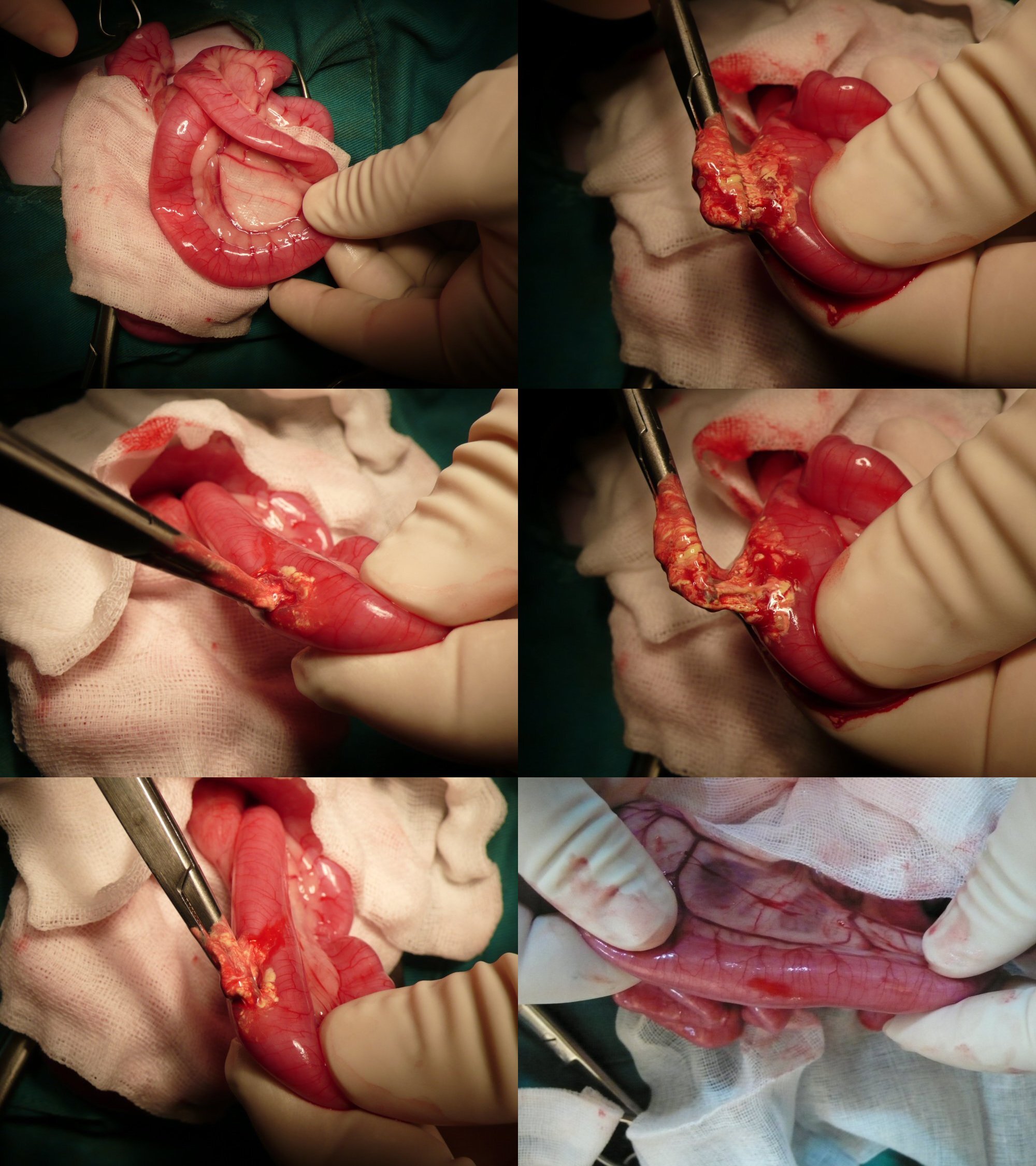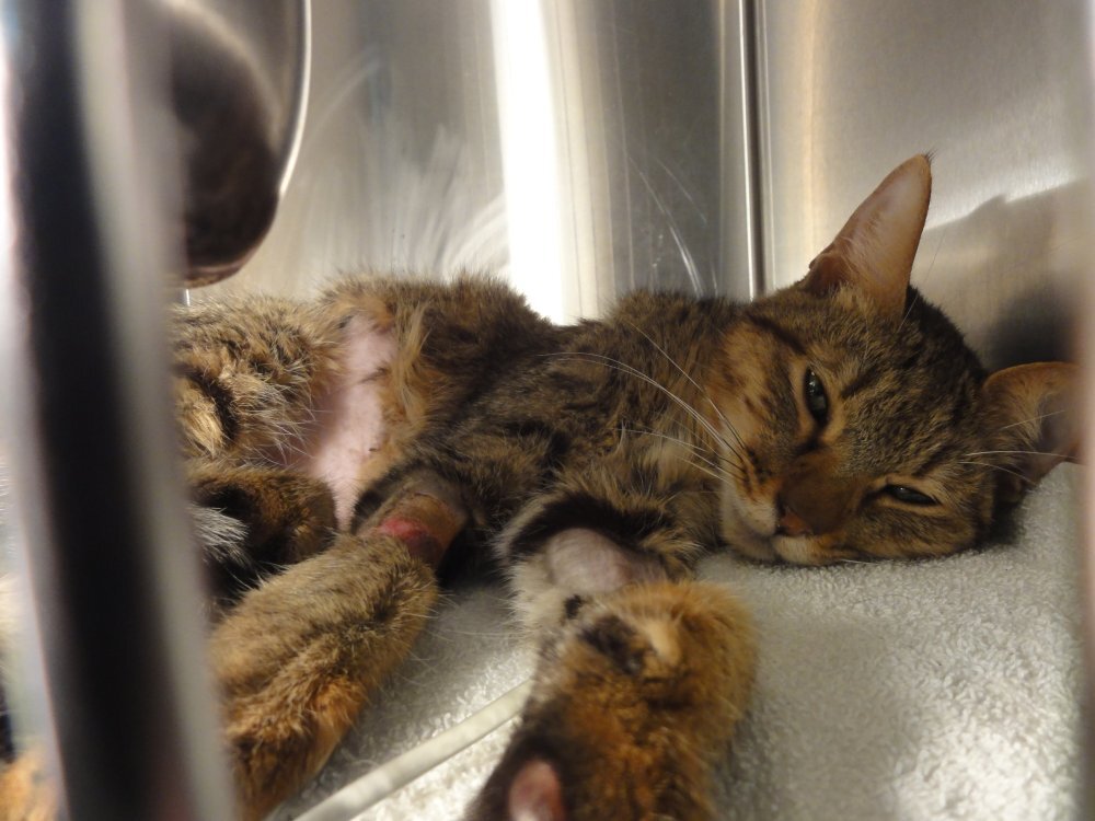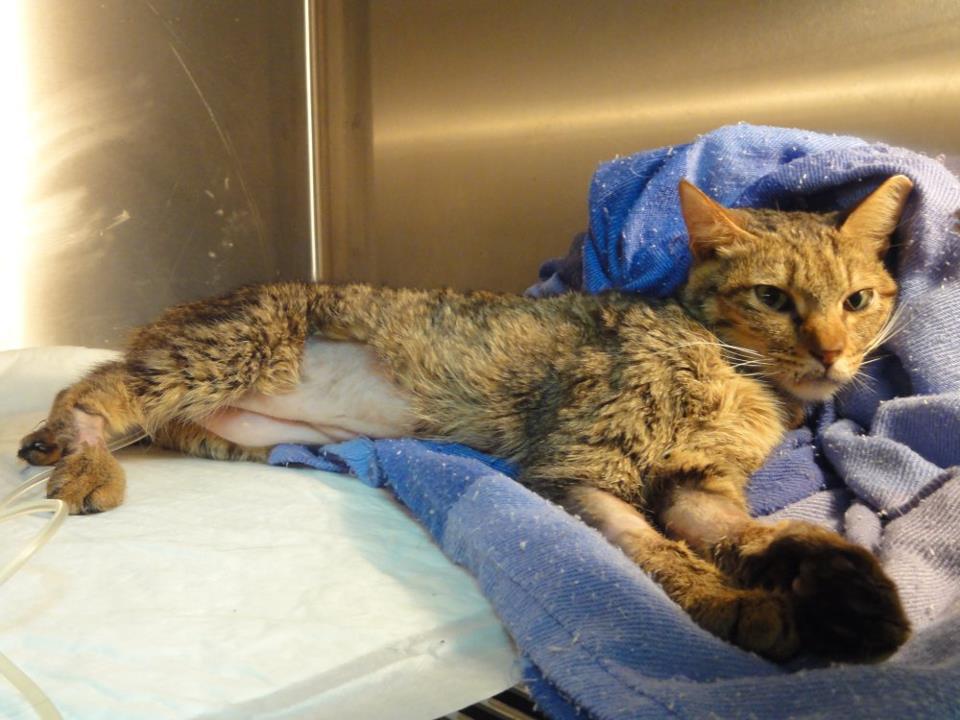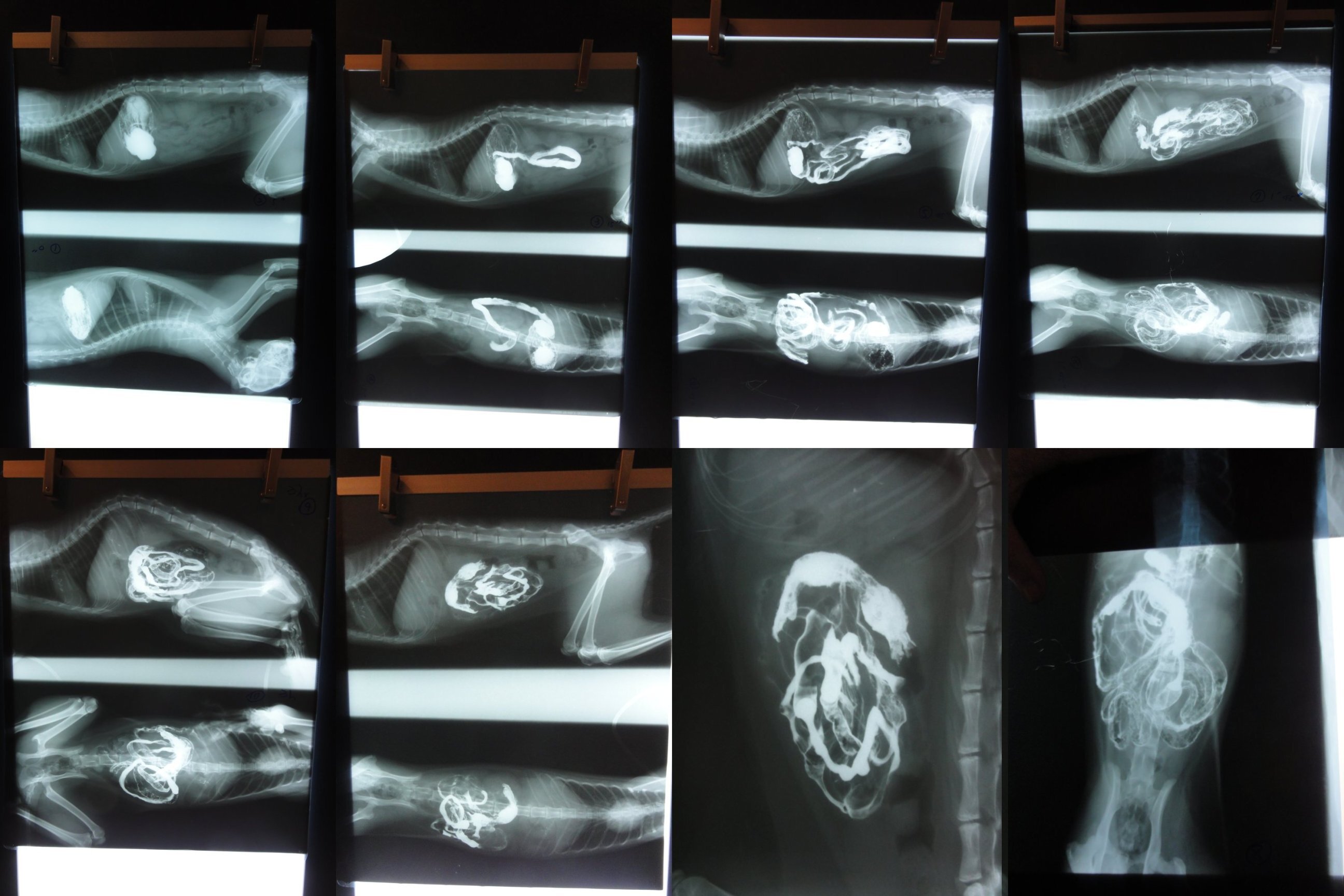 經過X光造影發現,腸內有異物阻塞,應是無法進食及嘔吐主因,經手術後取出類似粘土的不明物體,阻塞在腸內,原以為手術後應會很快恢復健康,但貓還是每天躺著,且有呼吸道感染,需做噴霧治療,無法自行進食,需以人工餵食,但可以明顯發現貓展現出他想進食的本能,只是無法自己起身吃東西,而進食後的嘔吐現象也沒有了,這期間做了血液檢查、細菌培養等,都呈現正常反應,但貓卻像一點力氣也沒有般的只能躺著,經過投以肌力無力症葯物,還是不見效果,貓最後因腦性麻痺導致全身肌肉無力,最後呼吸肌肉衰竭而離世。