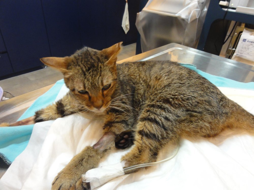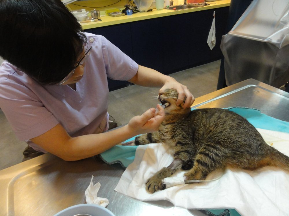 有天他發現有隻他餵養的貓,好幾天不吃飯,後來倒在路邊,他帶貓去看醫生,拿了一些葯,回家自己照顧,並給予灌食,但幾天過去,仍不見好轉還會嘔吐,仍無法進食,後來電話求助於我,請我幫忙看能否將貓轉送長沁,做檢驗,請醫師開葯,貓他帶回去照顧,經過二次門診檢查,貓還是沒好轉,仍不吃東西,安排住院做詳細檢查。