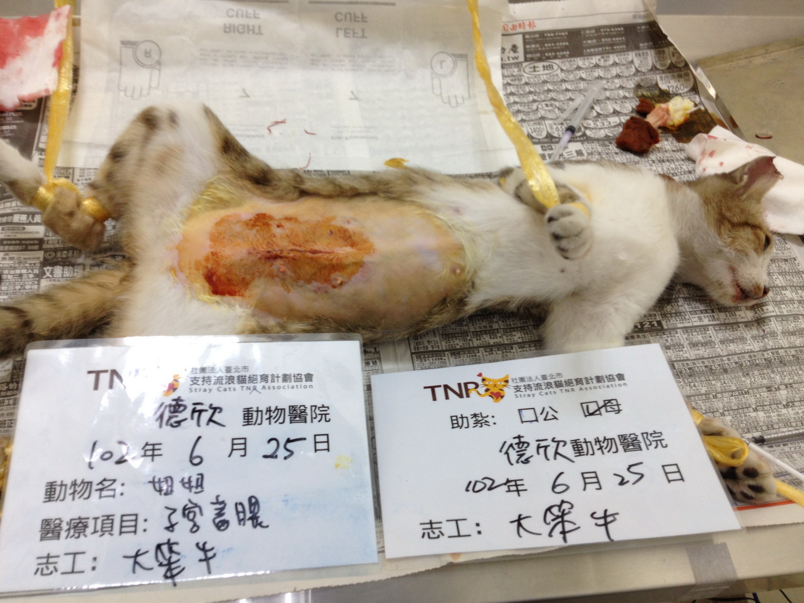 主題: TNR抓到嚴重子宫蓄膿的母貓 申請者姓名: 大笨牛 花色: 申請日期: 2013-07-04 00:59:23 申請者部落格: 申請者臉書網址: http://www.facebook.com/profile.php?id=1489838064 所在縣市/合作醫院: 新北市/德欣動物醫院 治療費用: 4400元 需求人數: 5人 已結案 (2013-07-09 13:57:36) 報名人員: 呂凡妮(已付款)、Cala Hsieh(已付款)、Rick Lin(已付款)、Cathy25(已付款)、ERic YU(已付款)、 候補人員: 動物病情說明: TNR捕抓到的母貓手術後發現有嚴重的子宫蓄膿現象