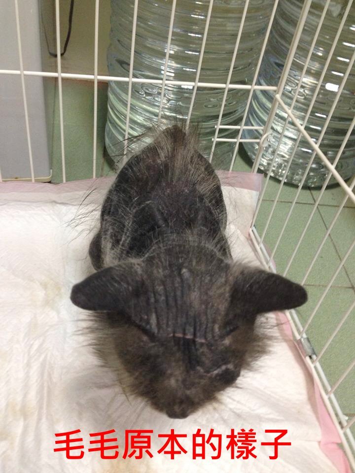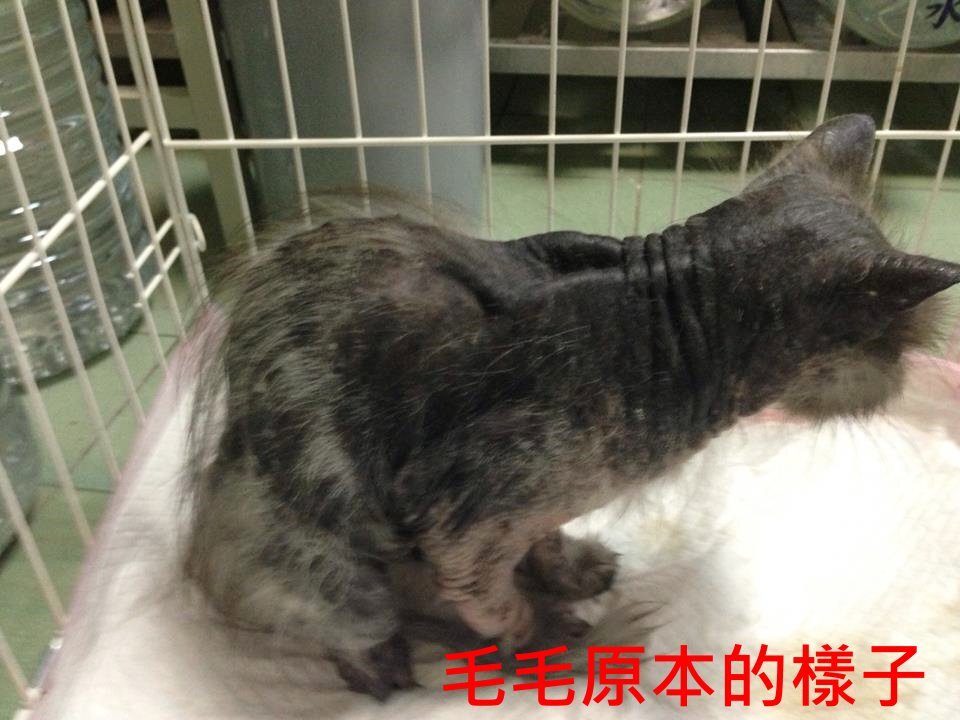 貓咪由彰化志工許桂菱和朋友協助捕捉送至台中,由熱心貓友M.l. Chen接力送回台北,送醫採樣檢驗不是黴菌也不是疥癬,血液檢查都正常,沒有愛滋白血、沒有貓瘟,食慾極佳、排尿很多、排便也很多,醫師懷疑是內分泌的問題,先將尿液和血液送檢,住院治療穩定後已先接回照顧。