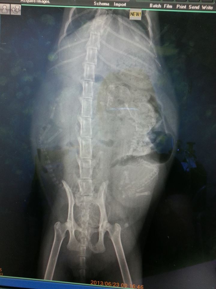 貓媽媽真的超乖!此時的她應該很不舒服、全身癱軟無力……但仍配合全程檢查。照X光發現,有兩條小脊髓很明顯,貓媽媽肚子內還有兩隻小貓!決定緊急進行手術。