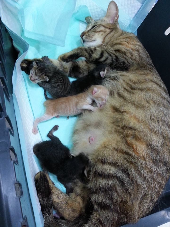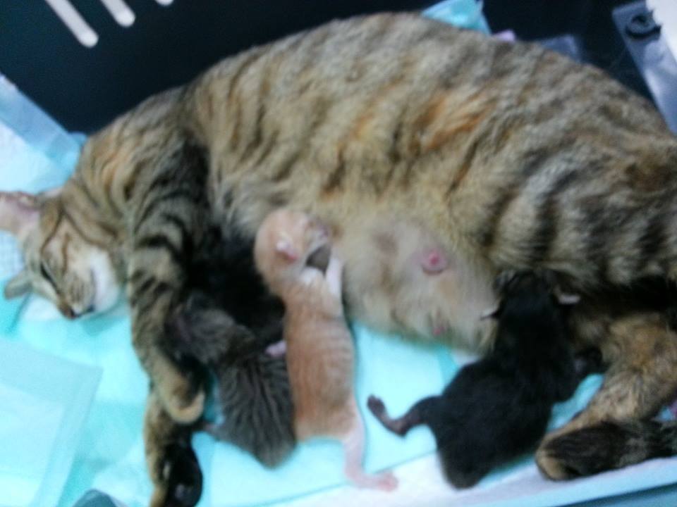 六月中旬週六皆有志工至協會幫忙打掃、出貨,喜歡湊熱鬧的貓媽媽就挑正午時開始生產,揀回的第五天。接近2點時,生了4隻的母貓就不生了……