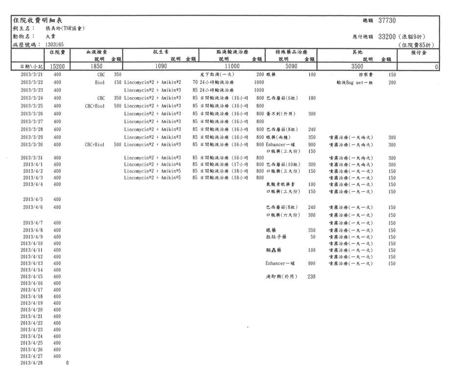 主題: 金山老街貓咪鼻氣管炎和貓瘟 申請者姓名: 臺北市支持流浪貓絕育計劃協會 花色: 申請日期: 2013-07-11 13:25:27 申請者部落格: 申請者臉書網址: 所在縣市/合作醫院: 台北市/長青動物醫院 治療費用: 48000元 需求人數: 100人 已結案 (2013-09-03 16:27:31) 報名人員: 林小昀(已付款)、Li Be(已付款)、陳育君(已付款)、陳育君、Alice Wang x2(已付款)、Stephen(已付款)、蔡秀芳 x2(已付款)、Vincy(已付款)、Grace Luo x2(已付款)、Li Li Hsieh x2(已付款)、justin0216(已付款)、上帝的寶貝珍珠(已付款)、chiawei x2(已付款)、beforn x2(已付款)、王妤婷(已付款)、阿章(已付款)、Bao BA HaoHao x2(已付款)、咪&達阿木 x2、Liyun Chang(已付款)、Chloe Liang x2(已付款)、David Wei(已付款)、Oc Liou(已付款)、karyn(已付款)、那(已付款)、Ying Jie Lee(已付款)、momo(已付款)、Mavis Yang(已付款)、邱小鯊、姍珊(已付款)、sam(已付款)、Ada Chiu(已付款)、思葦(已付款)、Winnie Lee(已付款)、Norn(已付款)、konana(已付款)、Sharon Kuo x6(已付款)、Winnie Chen x2(已付款)、Angel Cheng(已付款)、Jun Chiou(已付款)、chiawei(已付款)、Janny SU(已付款)、林嘉南 x2(已付款)、Arthur Jo(已付款)、Chiafen Tsai、ArthurJo(已付款)、Bella(已付款)、駱嘉祥、gg0102(已付款)、Zoe Hsiao x2(已付款)、蘇珮儀(已付款)、林小姐(已付款)、黃小吟、Suchen Lin(已付款)、Maco Pan x2(已付款)、陳品而(Elisha Wang) x6(已付款)、Fox Hu(已付款)、小凱(已付款)、Chaling Wang(已付款)、Chaling Wang、倩倩(已付款)、Layla Hsu(已付款)、Fiona Chen(已付款)、Huimin Liu x2、Huimin Liu x2(已付款)、濱井葉舞 x2(已付款)、Show(已付款)、gracekung x2(已付款)、Oz(已付款)、beforn(已付款)、李脆脆 x2(已付款)、楊政遠 x2(已付款)、Bella Hung(已付款)、杜玟嬅(已付款)、鄭庭如、鄭庭如(已付款)、Mi-ni Wang、TOM WANG x2(已付款)、Kim Meng(已付款)、Bonnie Su x2(已付款)、Vincent Ho(已付款)、閻豔(已付款)、 候補人員: Tiff、 動物病情說明: 張小姐陪先生至金山老街拜訪客戶,等待過程中發現有小貓咪眼睛感染嚴重,噴嚏連連,電話聯絡協會請求協助,張小姐不畏艱辛頂著八個月大的肚子,立刻捕捉送至醫院,因此還被貓咪咬傷,到院後醫師評估是鼻氣管炎有脫水的現象,打針後先請張小姐帶回點眼藥水、吃藥照顧,隔天複診,貓咪狀況惡化,緊急轉院至長青動物醫院,檢驗居然是幼貓致死率極高的貓瘟,併發嚴重鼻氣管炎,張小姐幫兩貓取名大富和大貴,希望小朋友耐過後可以否極泰來大富大貴。