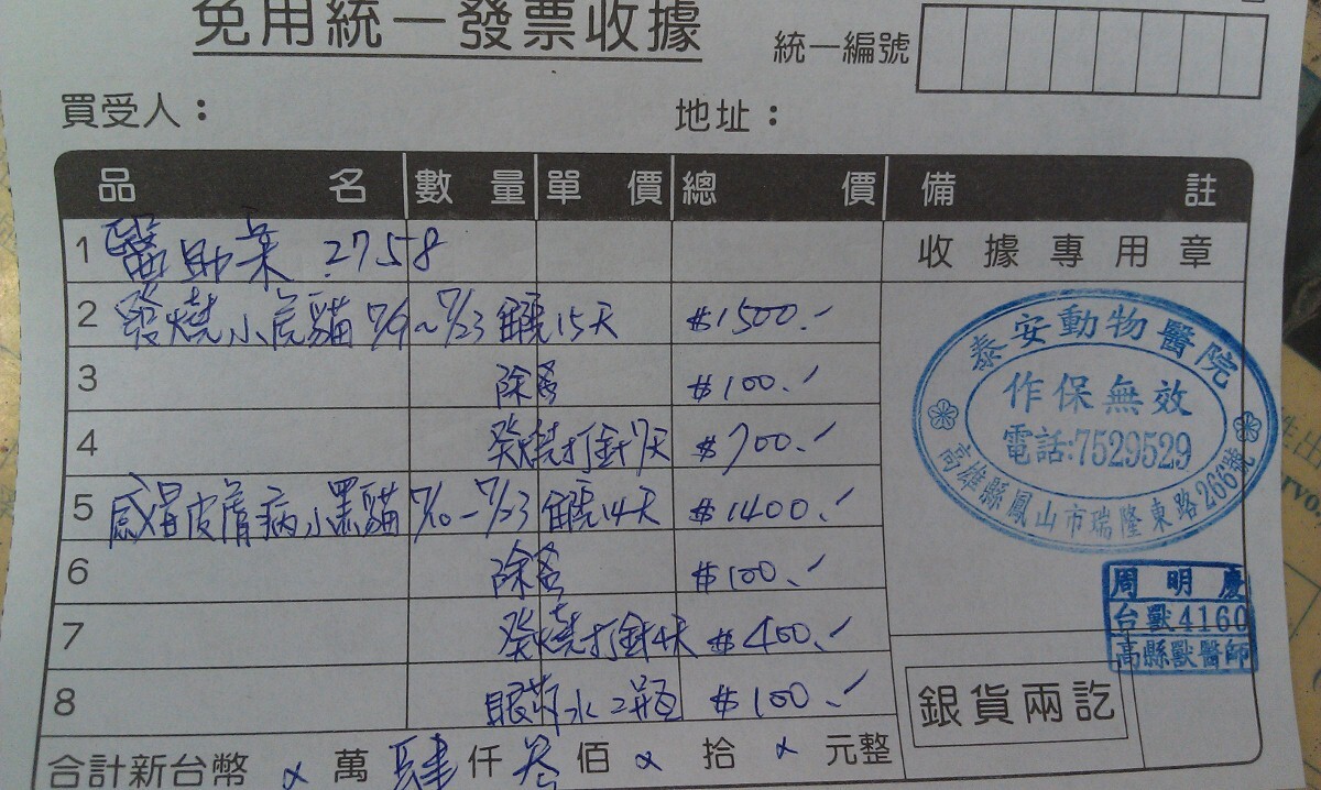1.發燒小虎貓 7/9-7/23 住院治療15天 1500