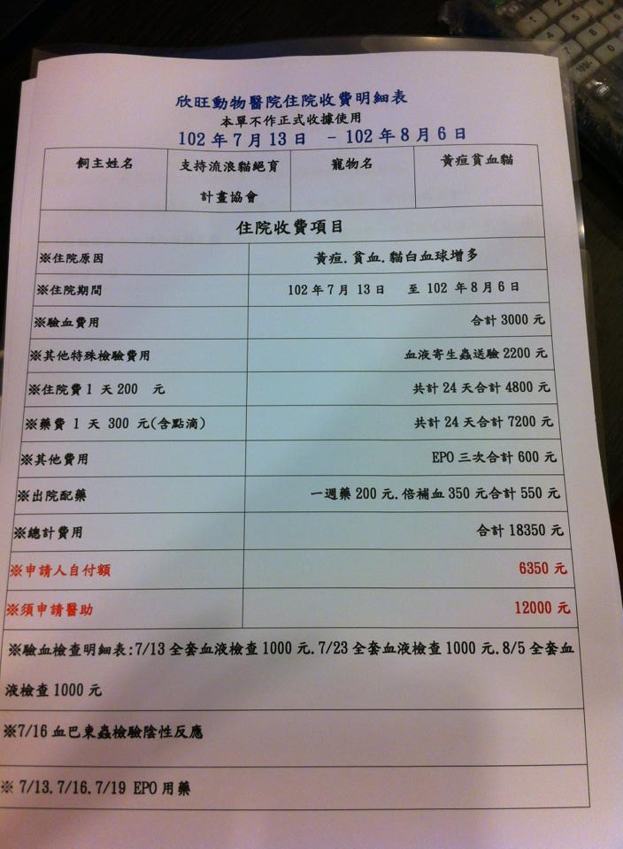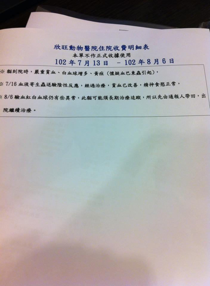 主題: 嚴重黃疸及貧血小三花貓 申請者姓名: 杜姵萱 花色: 申請日期: 2013-08-07 09:50:11 申請者部落格: 申請者臉書網址: 所在縣市/合作醫院: 台北市/欣旺動物醫院 治療費用: 12000元 需求人數: 26人 已結案 (2013-09-03 16:26:57) 報名人員: Kate Wang x2(已付款)、愛咪(已付款)、小黃(已付款)、Cola Wang(已付款)、Raikkonen(已付款)、Lorelei Tsai x2(已付款)、00(已付款)、韋懷思(已付款)、Venus Li(已付款)、Una Lee、mica 嘣糾(已付款)、Branden Chung x4(已付款)、賴霂菈(已付款)、QQ、QQ(已付款)、Joyce Yang(已付款)、Elvis Liu(維)(已付款)、Vincent Ho(已付款)、莉莉(已付款)、狐狸(已付款)、Aline Lee(已付款)、Jill Lee(已付款)、Liwing Lin(已付款)、 候補人員: 動物病情說明: 小三花已經受我爸媽餵養好一段時間了。