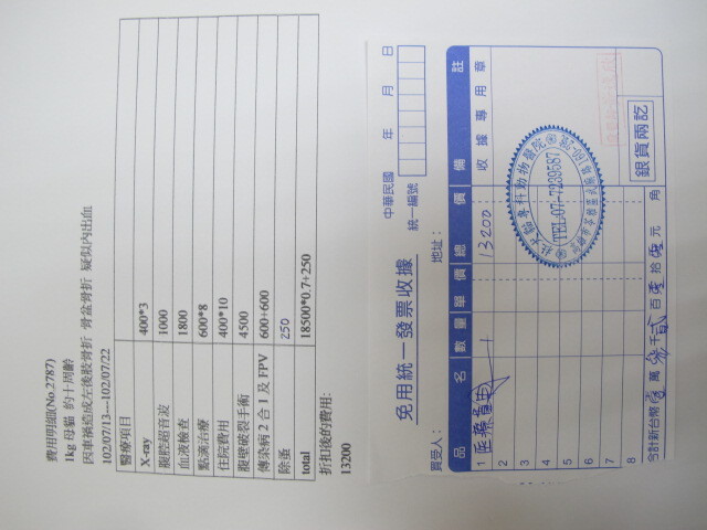 主題: 請幫忙救助車禍小花貓謝謝大家!!! 申請者姓名: 蔡子淳 花色: 申請日期: 2013-07-25 00:52:36 申請者部落格: 申請者臉書網址: 所在縣市/合作醫院: 高雄市/恩澤動物醫院 治療費用: 13200元 需求人數: 15人 已結案 (2013-09-03 16:26:30) 報名人員: 陳小茜(已付款)、Annie Wu(已付款)、江偵安(已付款)、Nick Liu、Nick Liu x5(已付款)、游妹妹(已付款)、Jennifer Hu(已付款)、呂漢祥(已付款)、WeiLin Chen(已付款)、Monica Tsai(已付款)、okina(已付款)、陳倩婷(已付款)、 候補人員: 動物病情說明: 你好~
