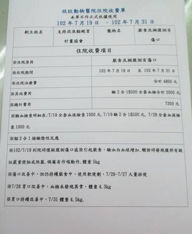 主題: 胸口咬傷爆膿白血球過高不肯進食 申請者姓名: 臺北市支持流浪貓絕育計劃協會 花色: 申請日期: 2013-08-05 17:35:08 申請者部落格: 申請者臉書網址: 所在縣市/合作醫院: 台北市/欣旺動物醫院 治療費用: 7300元 需求人數: 17人 已結案 (2013-09-03 16:25:32) 報名人員: 婉妤(已付款)、那口貓 x10(已付款)、迷迷、Soso Chiang x5(已付款)、Daisy Juang(已付款)、 候補人員: 動物病情說明: Andrew Jin貼在請支持流浪貓TNR計劃求助文