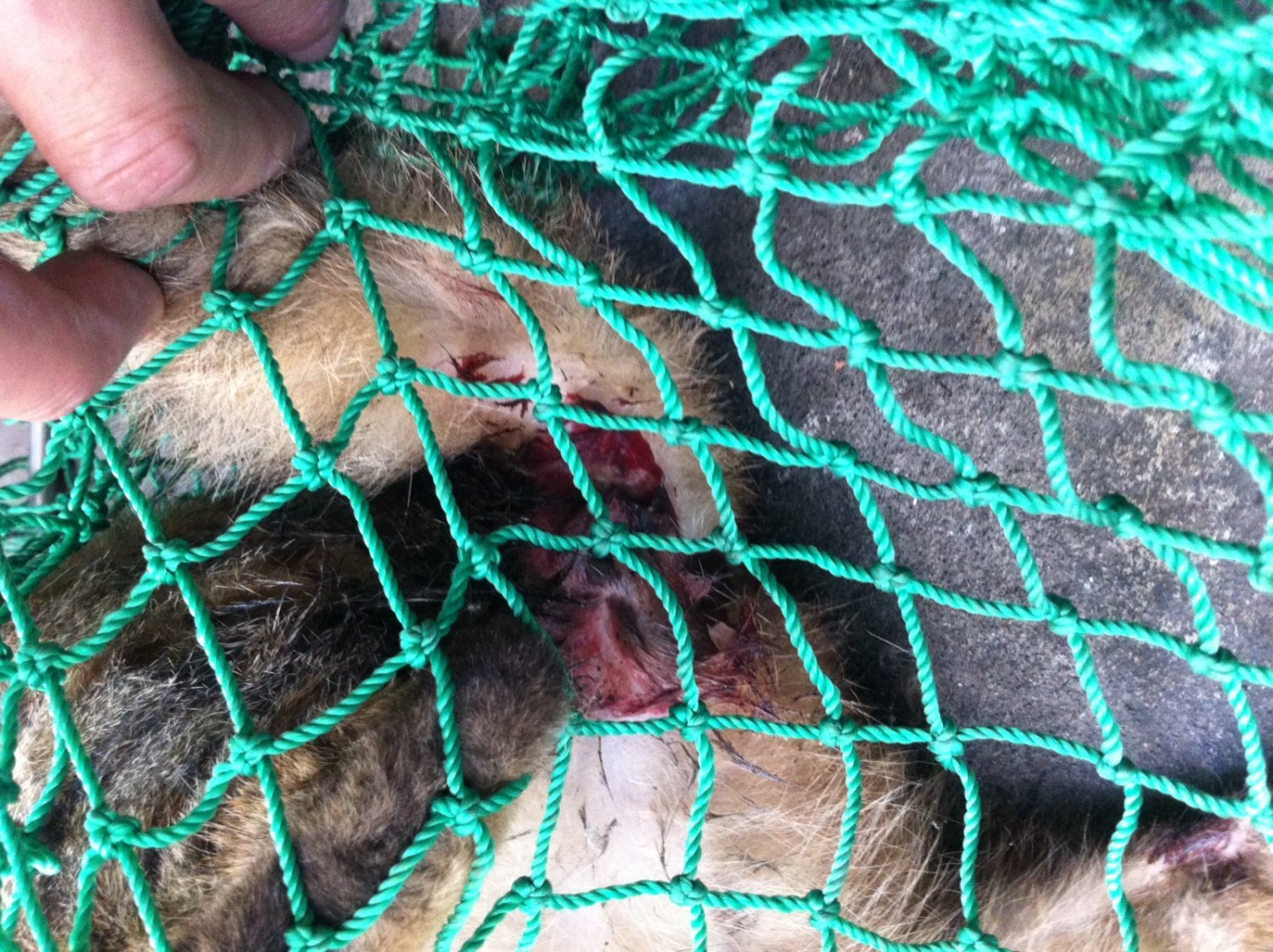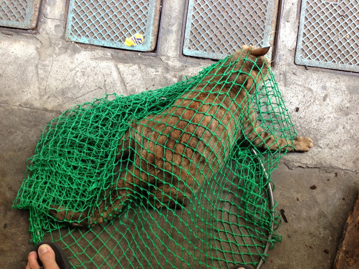 ,用網子將貓網住,發現貓咪應是難產,緊急送到合作醫