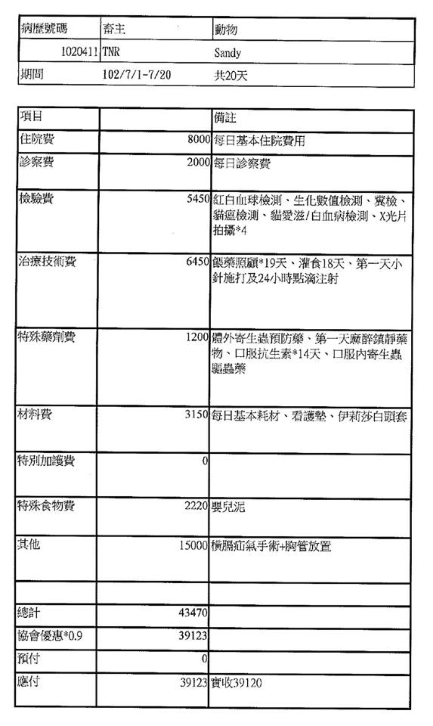 主題: 三和路難產母貓救援 申請者姓名: 臺北市支持流浪貓絕育計劃協會 花色: 申請日期: 2013-07-30 10:18:31 申請者部落格: https://www.facebook.com/SupportTNR 申請者臉書網址: 所在縣市/合作醫院: 台北市/極光動物醫院 治療費用: 39120元 需求人數: 42人 已結案 (2013-09-03 16:24:49) 報名人員: Cherry Lin x2(已付款)、Cherry Lin x2、Kim Meng(已付款)、Satine Hsu(已付款)、Elaine Yang(已付款)、Jocelyne YuYu Kao(已付款)、Li Hua(已付款)、POPO、紅色柚子(已付款)、包籠欣(已付款)、江偵安(已付款)、懂懂沒(已付款)、唐韻婷(已付款)、li(已付款)、Weiwen Tu、Weiwen Tu(已付款)、new麻(已付款)、阿短(已付款)、李璟芳(已付款)、Nico Liu(已付款)、Anq Liao(已付款)、艾維兒 x5(已付款)、Lilyanna(已付款)、gg0102(已付款)、林韋韋(已付款)、Chu(已付款)、Lydia(已付款)、Annisui Strauss(已付款)、Louise Liao(已付款)、茶茶(已付款)、Phoebe Chen(已付款)、Becca Huang(已付款)、Yegi(已付款)、Jackie Kang(已付款)、Pei-yan Wu(已付款)、Juliet(已付款)、Emily Liu(已付款)、vivian(已付款)、River Chang(已付款)、Patrick(已付款)、 候補人員: 動物病情說明: 粉絲頁面訊息通報,位在三重三和路,有隻母貓,疑似被車撞到,下體流血,