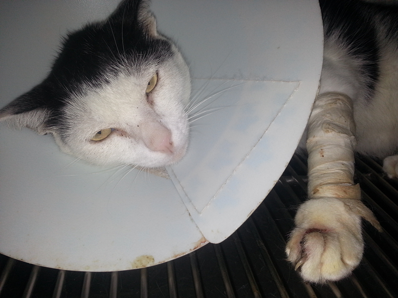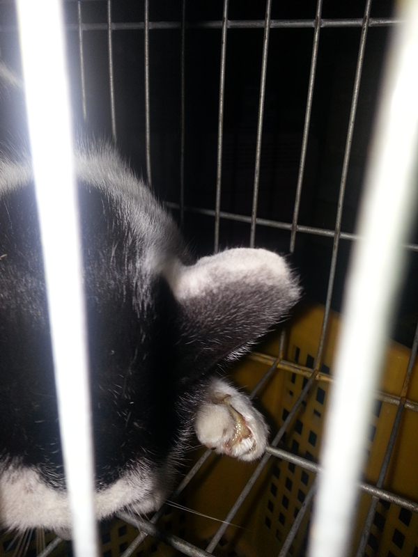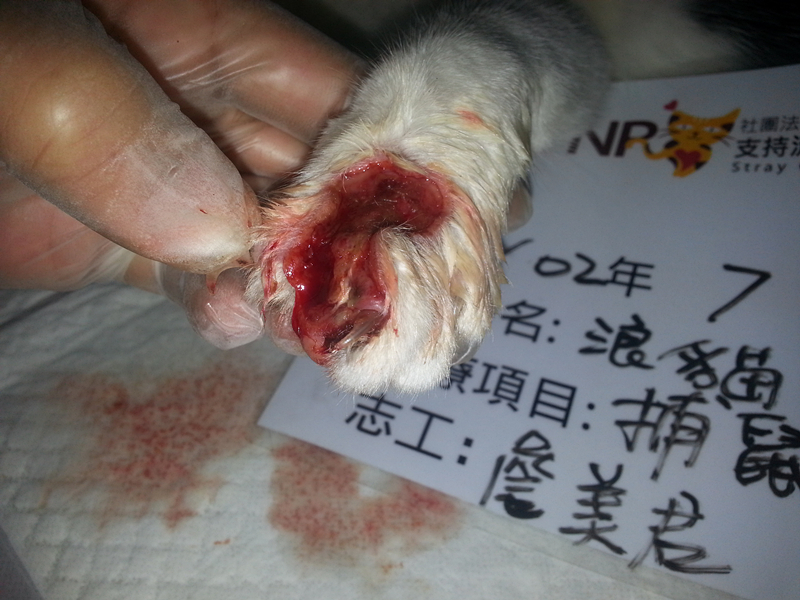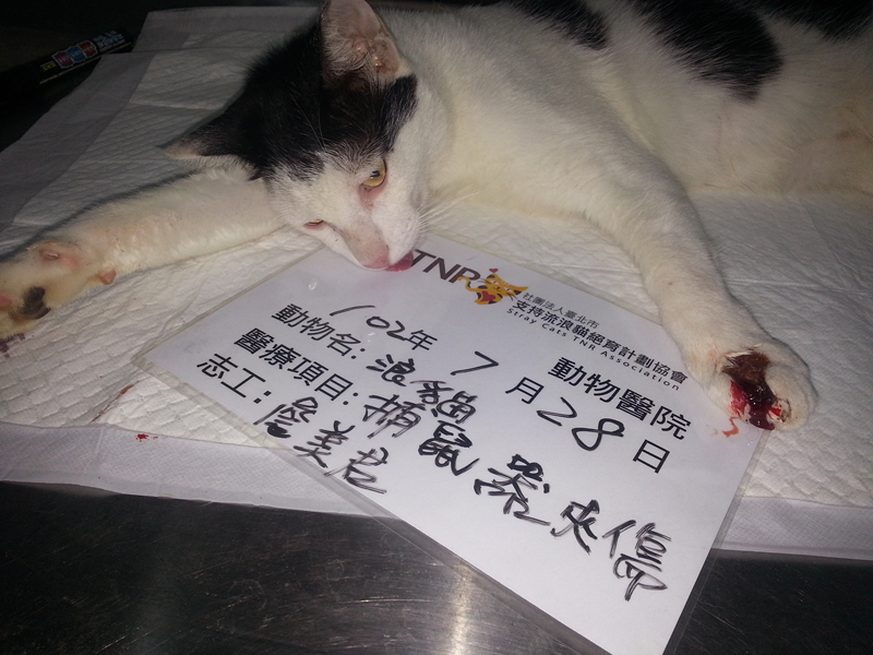主題: 疑似捕獸夾傷口了黑白貓 申請者姓名: 詹小君 花色: 申請日期: 2013-08-13 00:38:12 申請者部落格: 申請者臉書網址: 所在縣市/合作醫院: 台中市/聖欣動物醫院 治療費用: 5000元 需求人數: 6人 已結案 (2013-09-03 16:24:27) 報名人員: Christina Chiang x2(已付款)、Annisui Strauss(已付款)、蕭泰咪(已付款)、周家瑄(已付款)、Wendy(已付款)、 候補人員: 動物病情說明: 他是我餵養區域固定的食客 ~