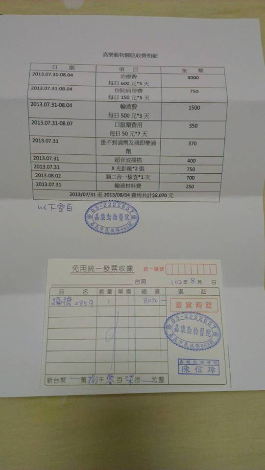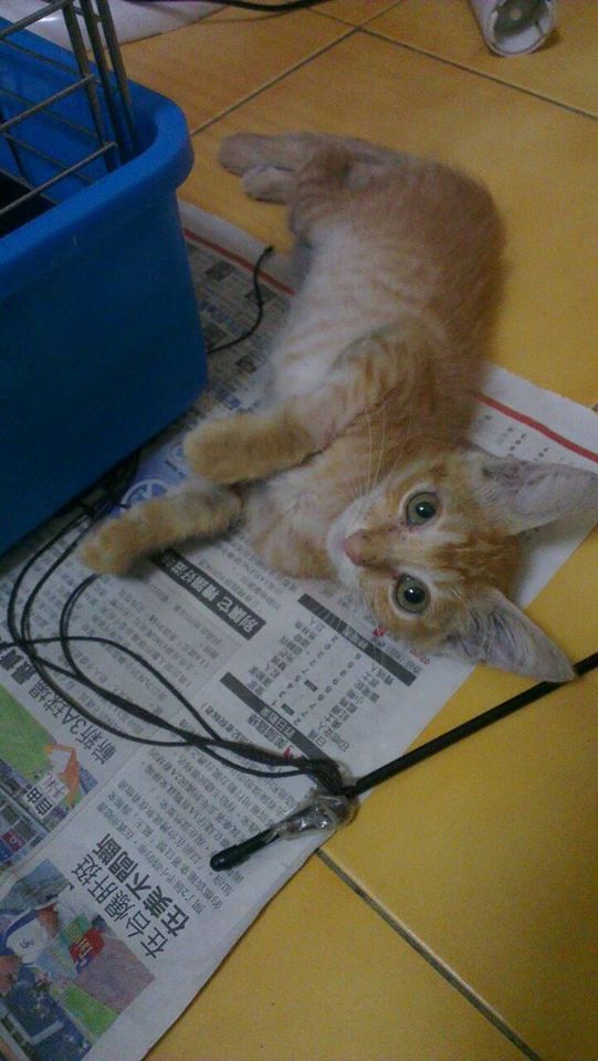 主題: 兩~三個月大的疑似車禍癱瘓小貓 申請者姓名: 張家榛 花色: 申請日期: 2013-08-11 00:35:10 申請者部落格: 申請者臉書網址: 所在縣市/合作醫院: 嘉義市/嘉樂動物醫院 治療費用: 8070元 需求人數: 18人 已結案 (2013-09-19 17:52:00) 報名人員: Kate Liao(已付款)、Jolin Lin(已付款)、Jolin Lin(已付款)、阿琴(已付款)、Jillfly(已付款)、Jason Chang x2(已付款)、dodo x2(已付款)、Shizuka Ho(已付款)、婷(已付款)、Kate Wang x2(已付款)、Kate Wang、Susanna Chueh(已付款)、鄭小花(已付款)、Claire Li(已付款)、Ping Meng(已付款)、Sakura Jui、Drew 酷朱(已付款)、 候補人員: 動物病情說明: 一隻下半身疑似骨折貓咪,以匍匐前進方式爬到路旁,因為已經接近10點,打了3間醫院電話,第3間請我馬上送過去,恰巧是有合作的嘉義嘉樂醫院,醫生一開始做了一下評估,下半身深層痛覺及神經反射皆沒有,做了X光跟超音波,說是骨盆骨折、薦椎椎盤碎裂及腹腔出血、還有貧血情形,目前大小便無法自解,需人工擠,擠出來的便是黑便(表示胃腸出血),醫生表示未來須長期吃神經方面的藥、定時擠壓大小便,希望能由協會幫忙醫療費用及尋找能照護小貓的主人或中途 動物近況說明: 目前已接回家暫時照顧,並尋找中途或認養人中
